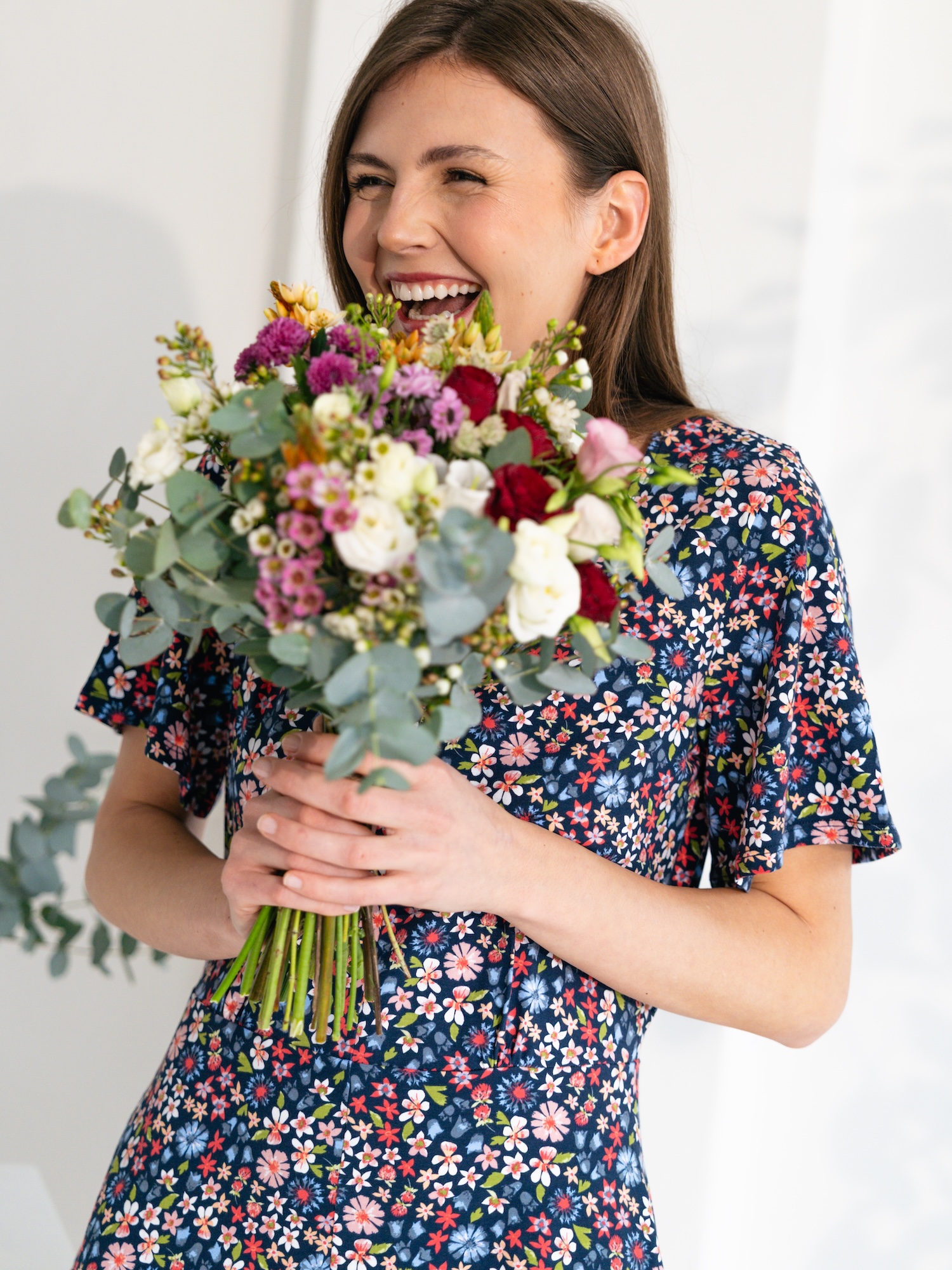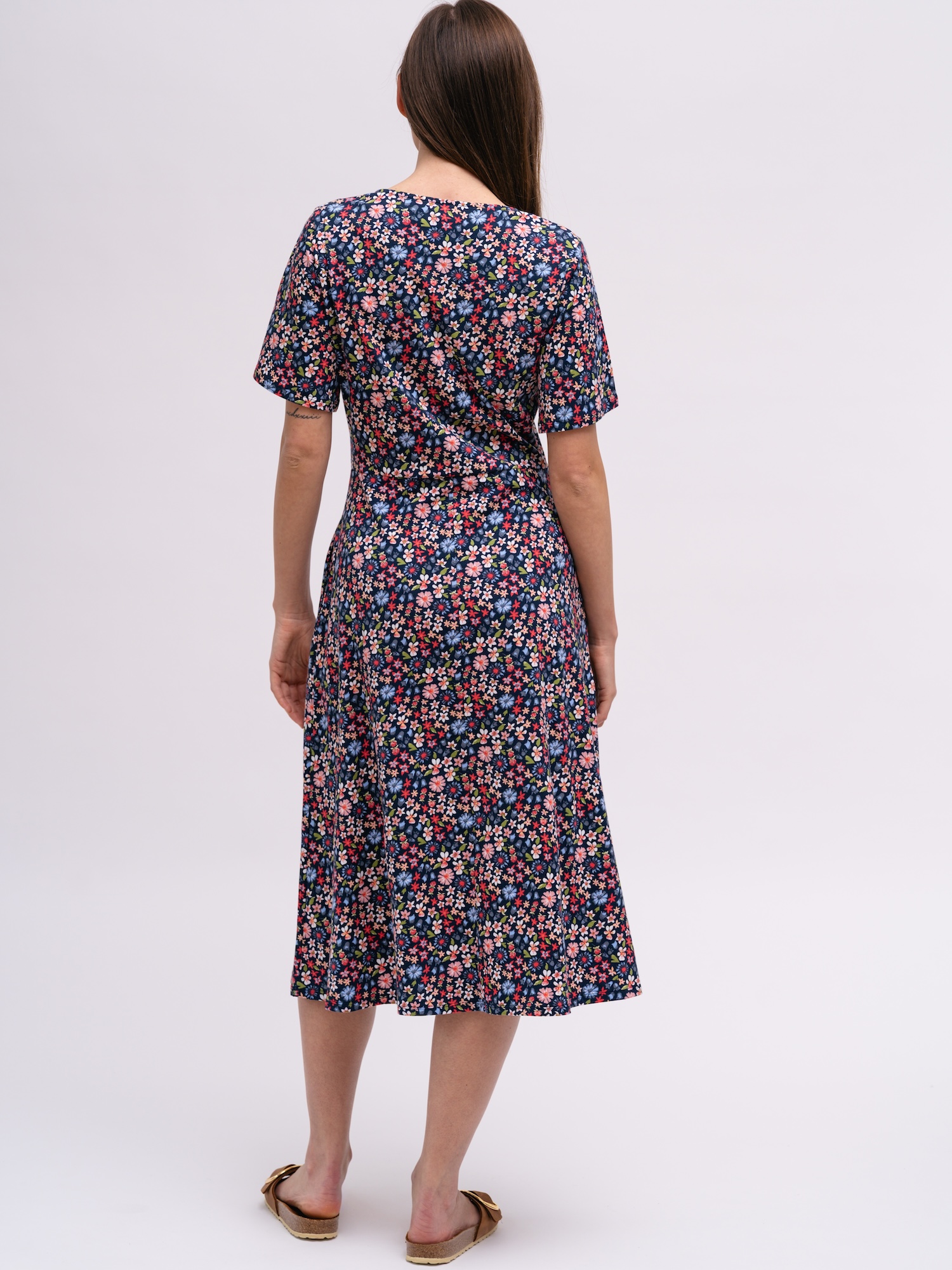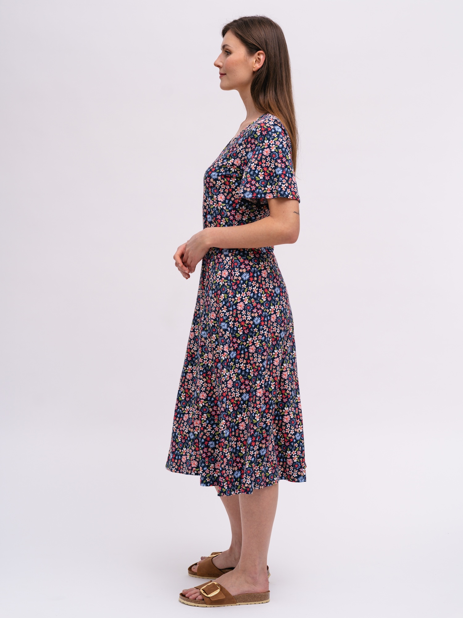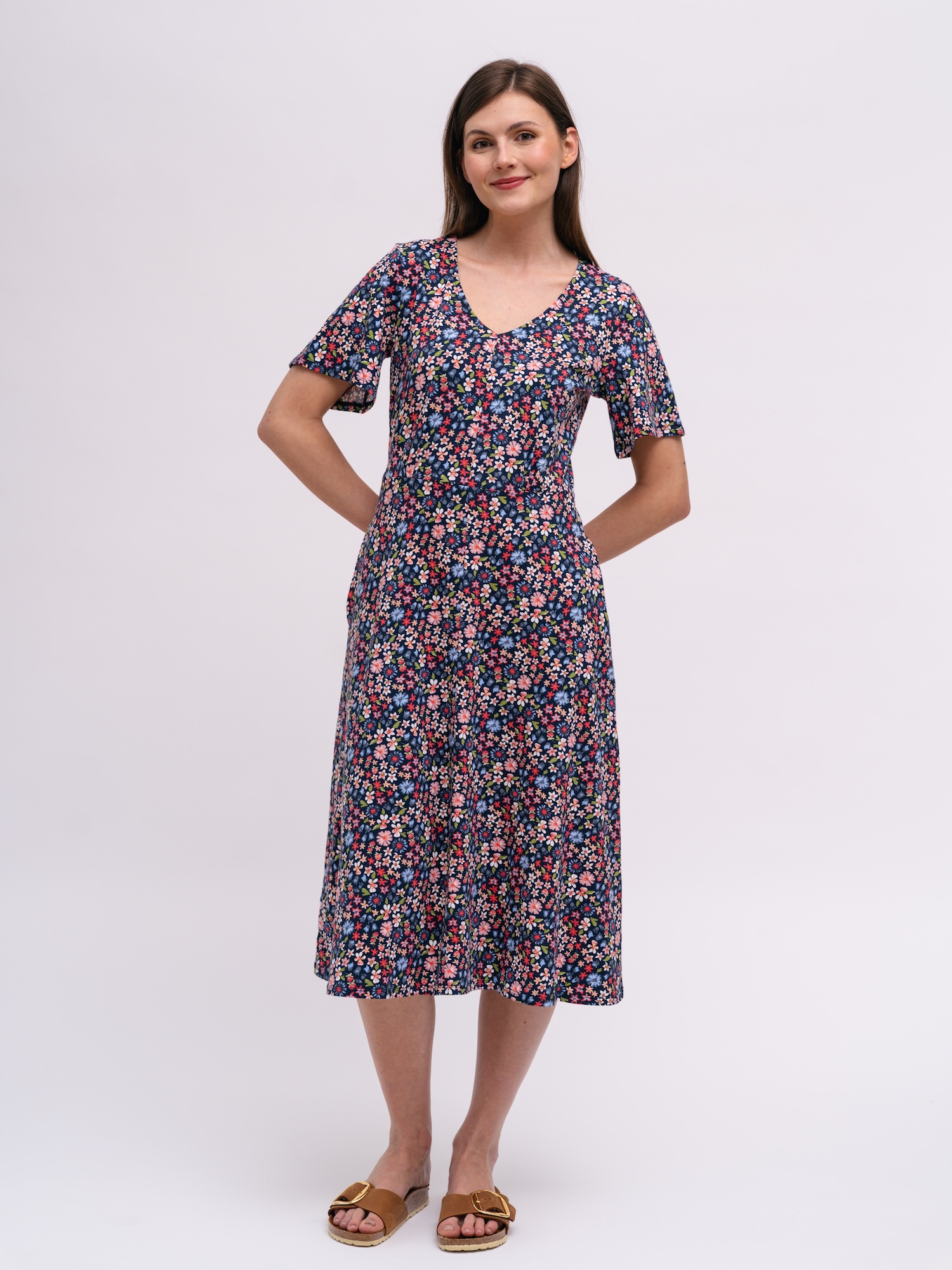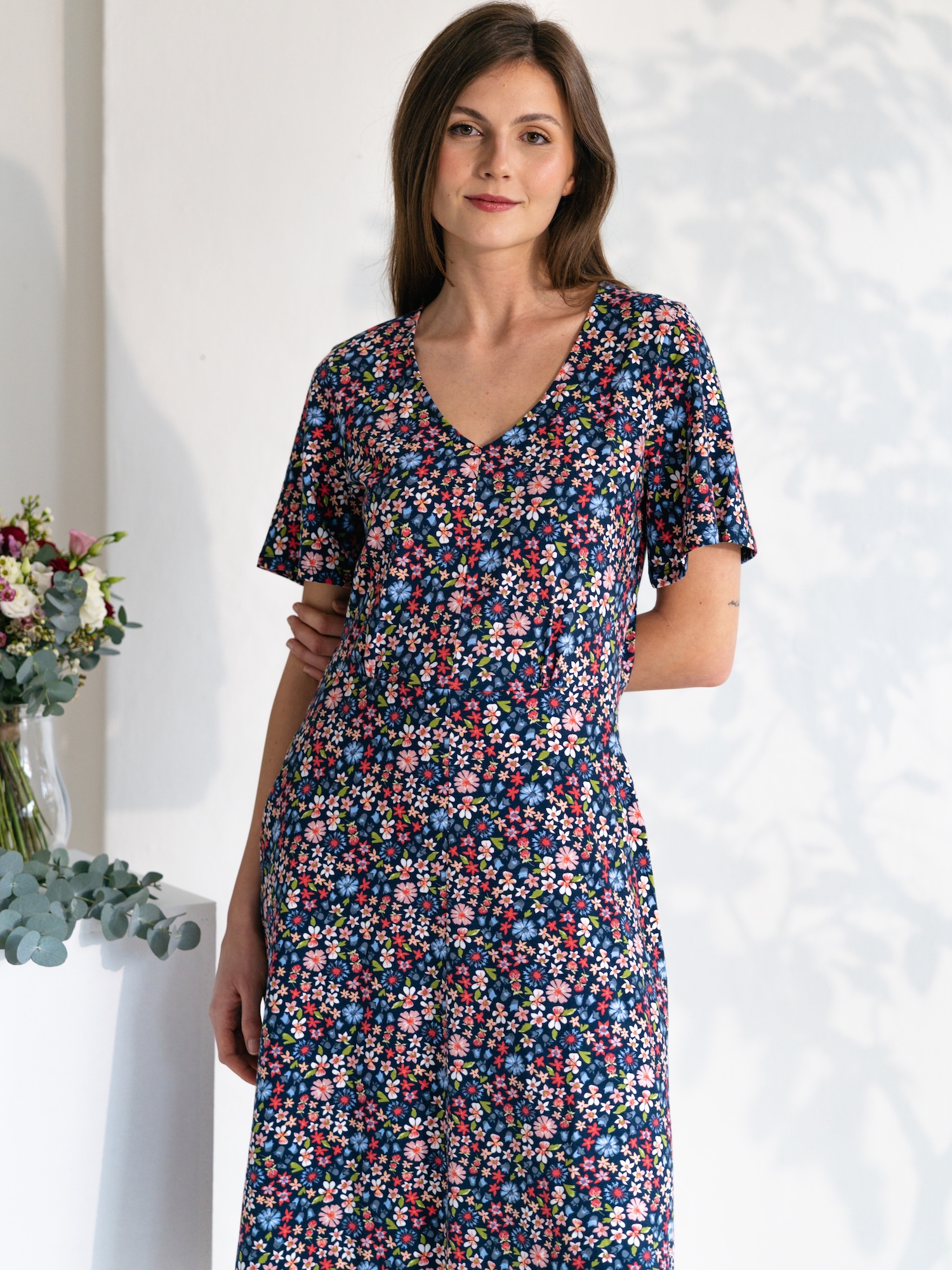Kwiatowy wzór luźnej sukienki nadaje jej sezonowy, radosny charakter. Dekolt w serek i boczne kieszenie zapewniają wygodę podczas spacerów i codziennych aktywności.