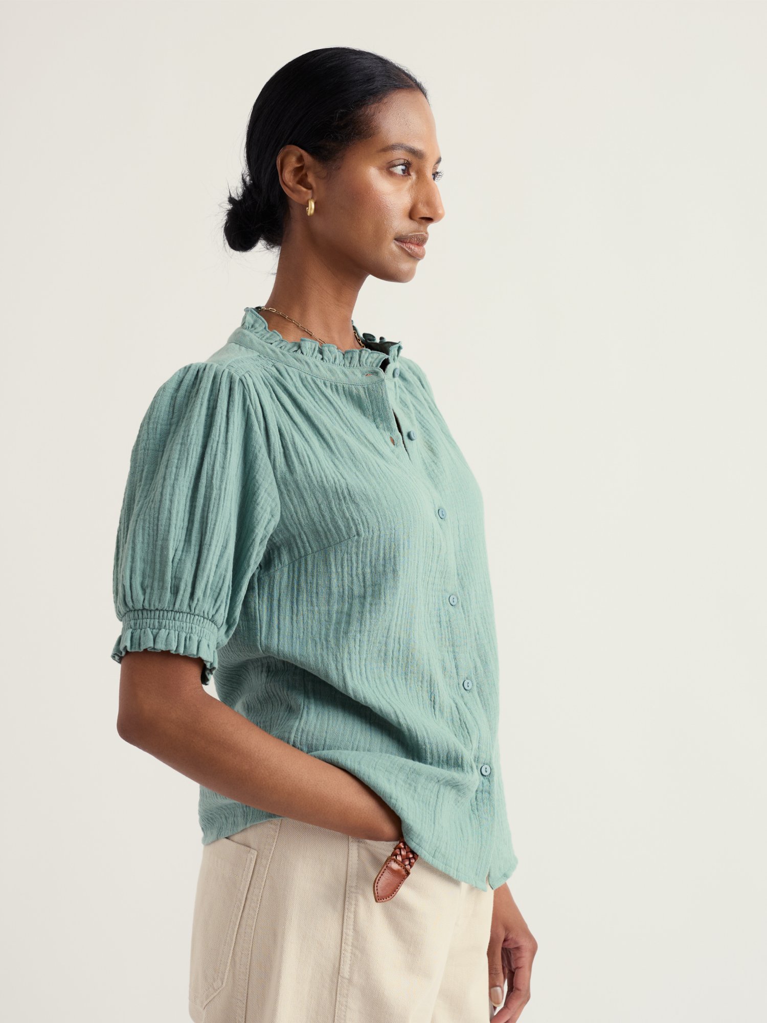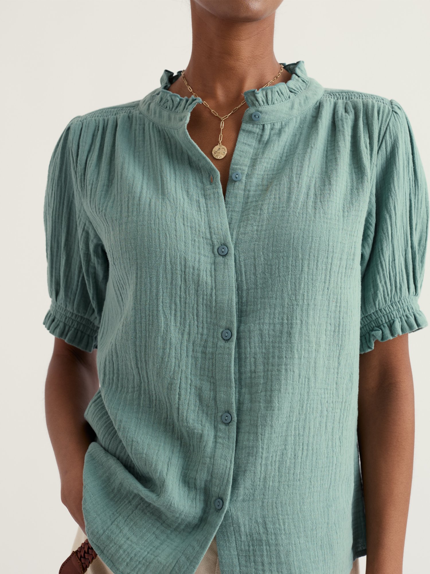 Czerwona bluzka doda energii codziennym stylizacjom, od biura po popołudniową kawę. Stójka tworzy uporządkowaną linię przy szyi bez zbytecznych ozdób.
