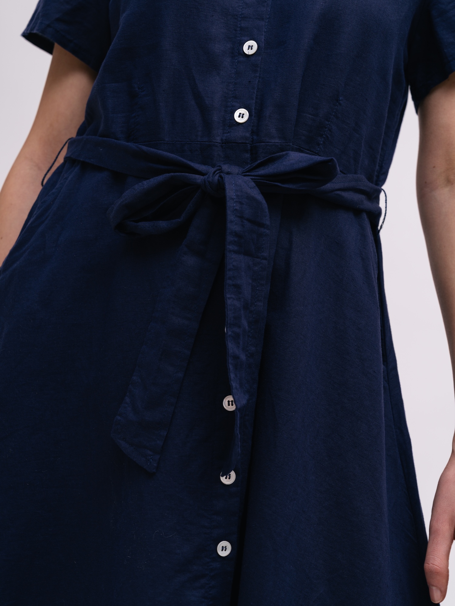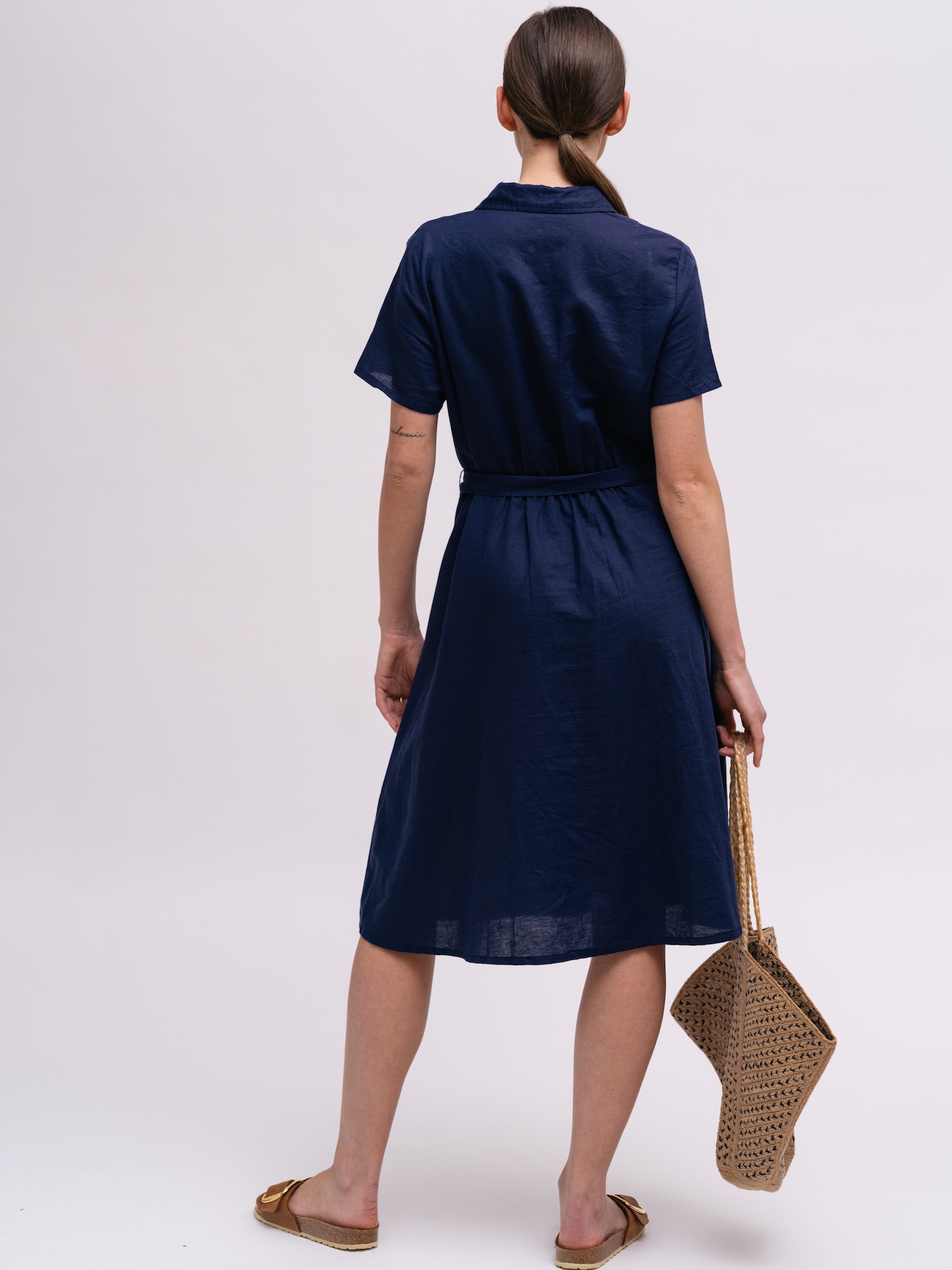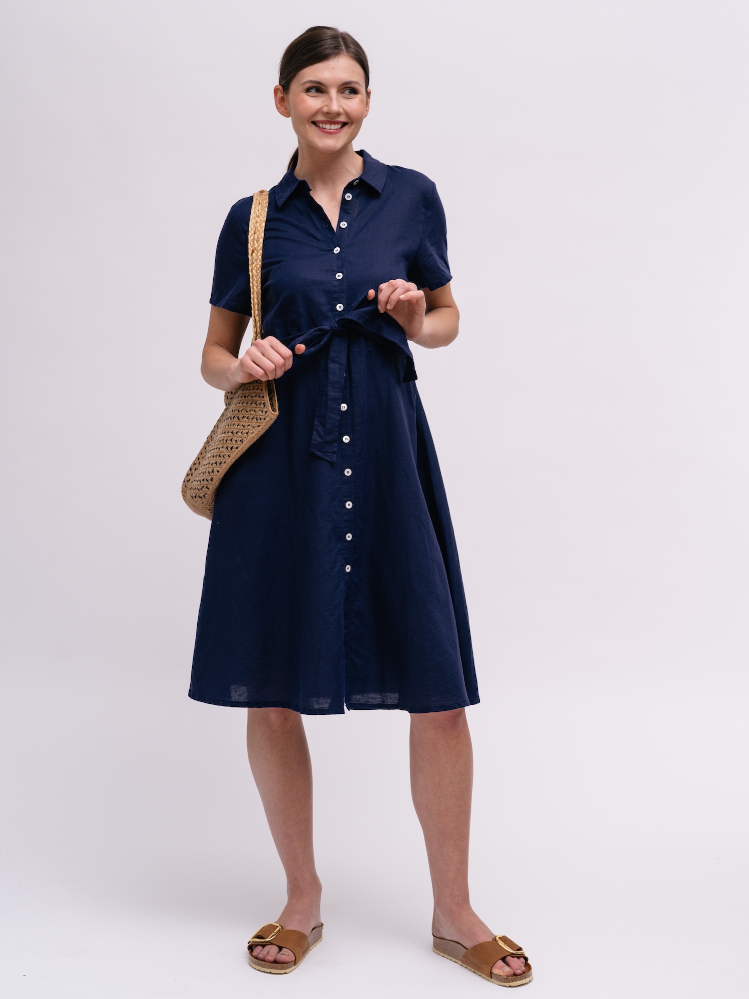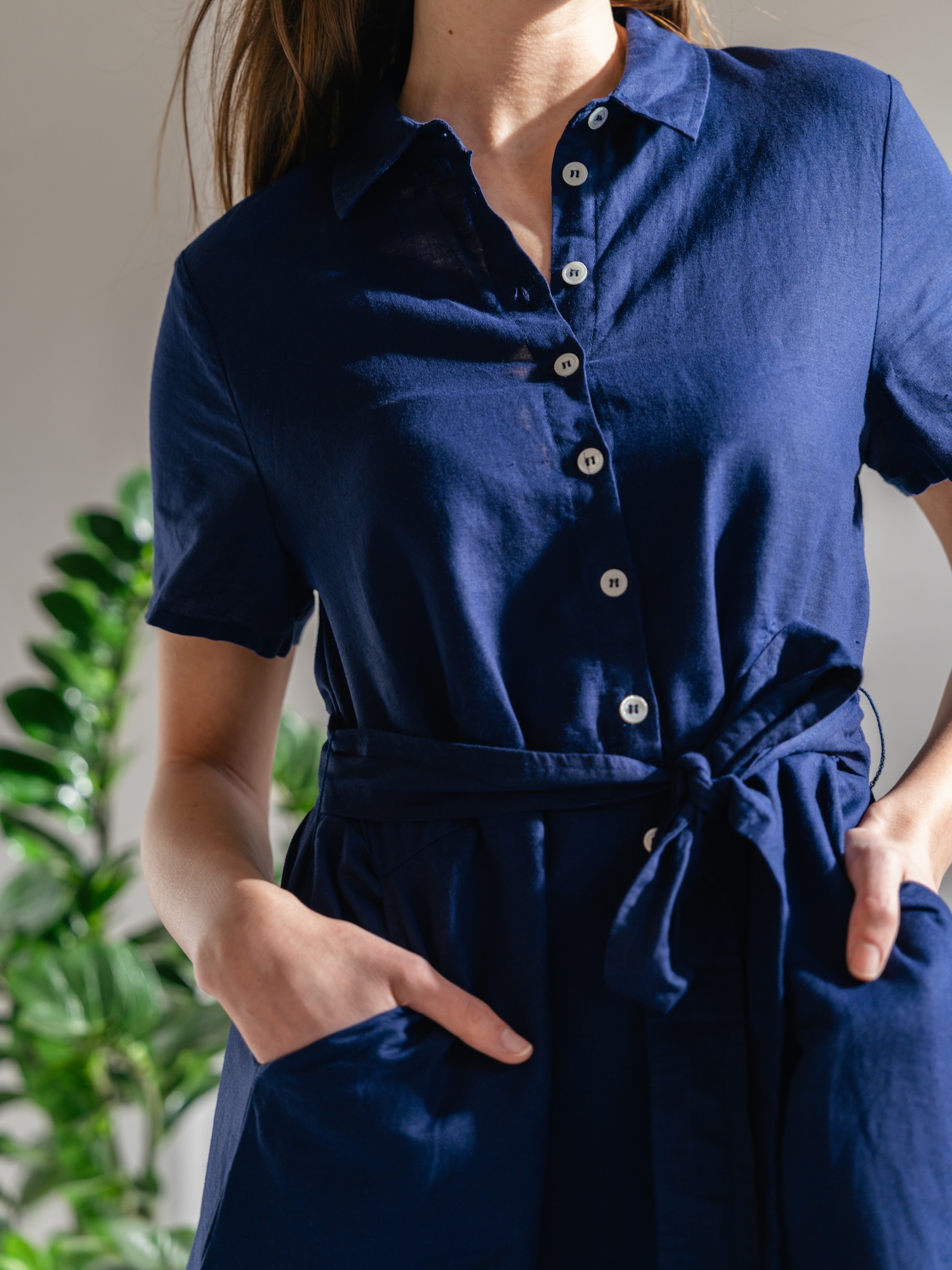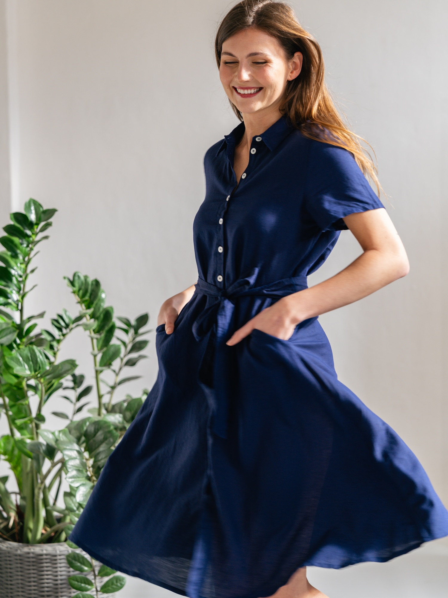 Granatowa sukienka koszulowa to klasa w prostocie, idealna do biura i poza nim. Guziki oraz wiązany pas ułatwiają dopasowanie stylizacji do okazji.