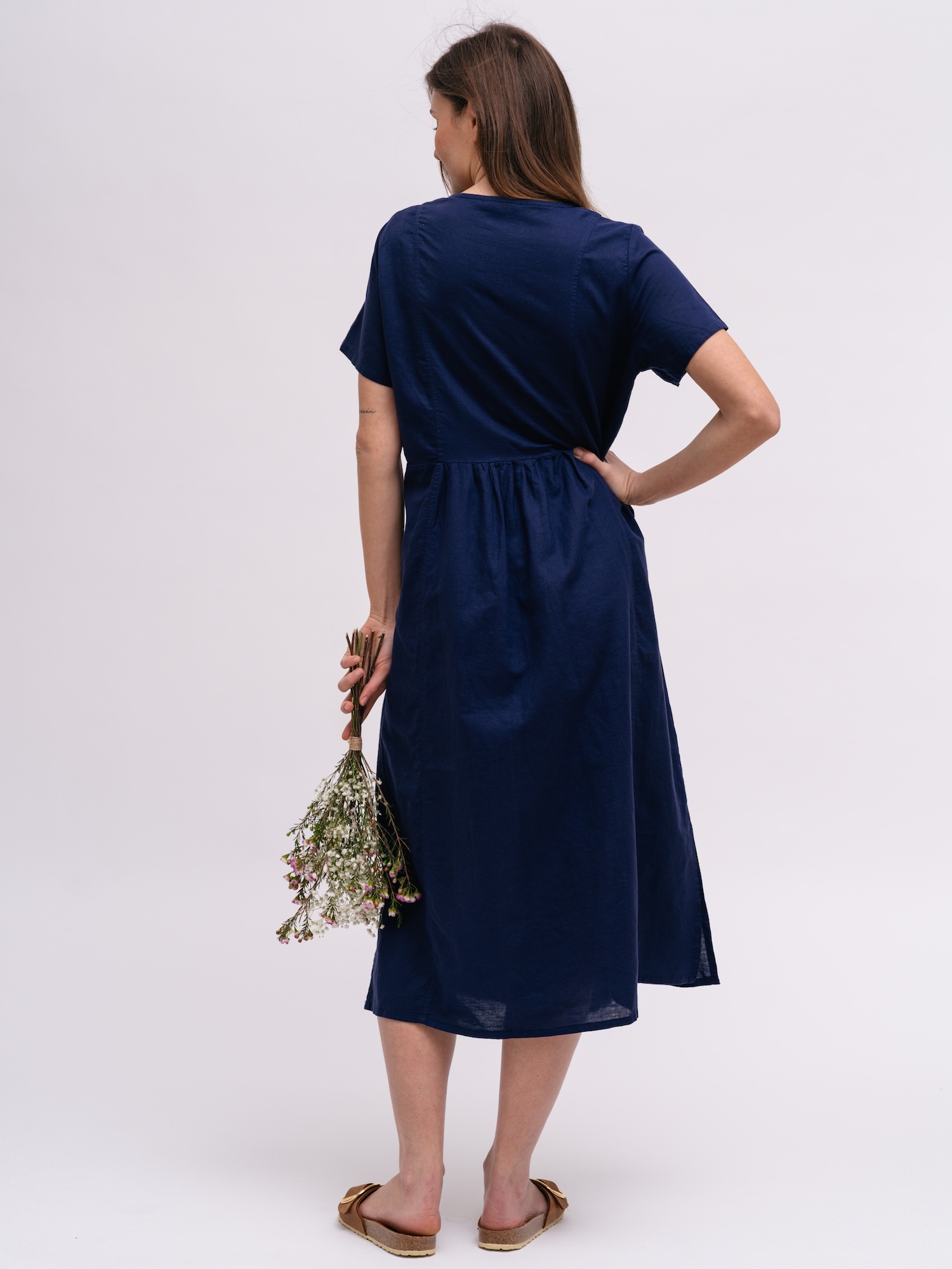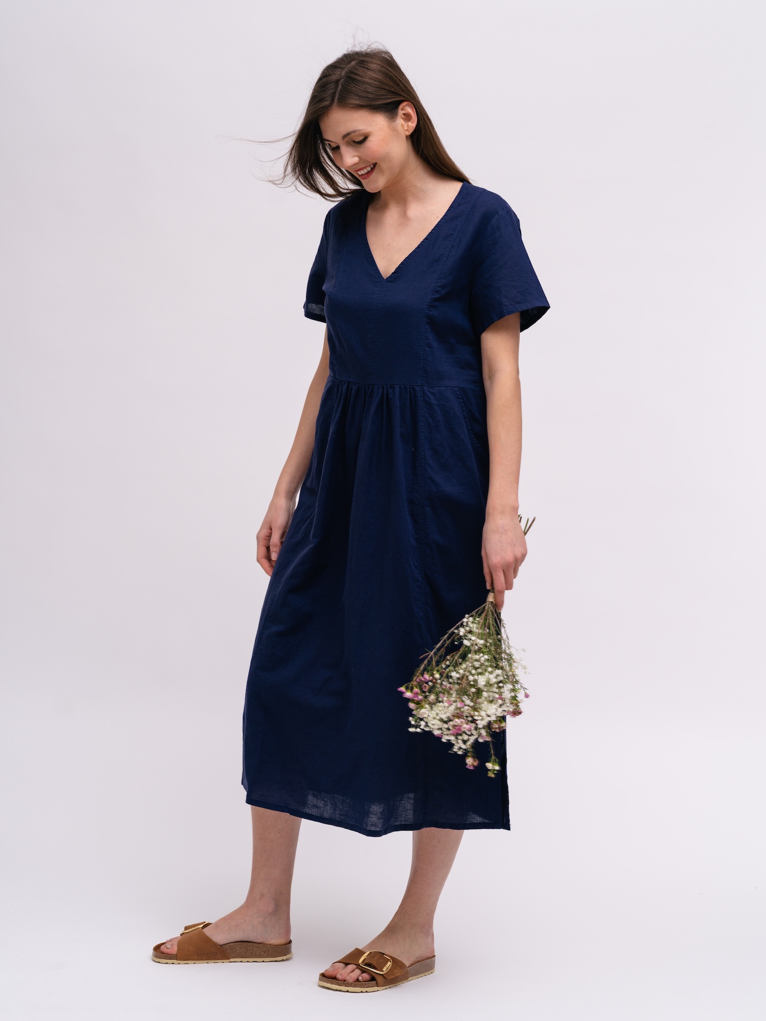 Lekka lniana sukienka z dekoltem w serek to idealny wybór na ciepłe dni. Naturalna faktura sprawdza się na wakacjach i w mieście.
