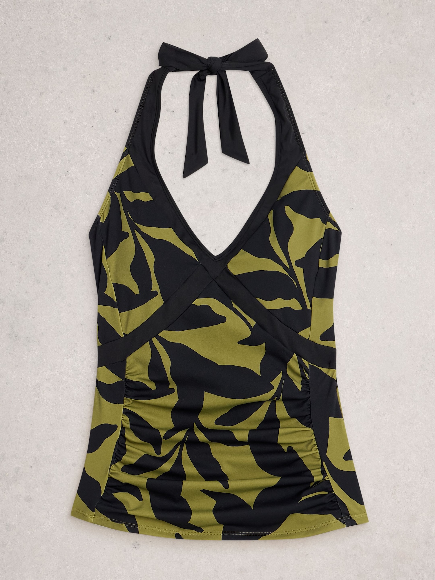 Góra od kostiumu ma klasyczny krój z dekoltem w serek, który ładnie układa się na ciele. Wiązanie na troczki i podszewka zapewniają większy komfort noszenia.
