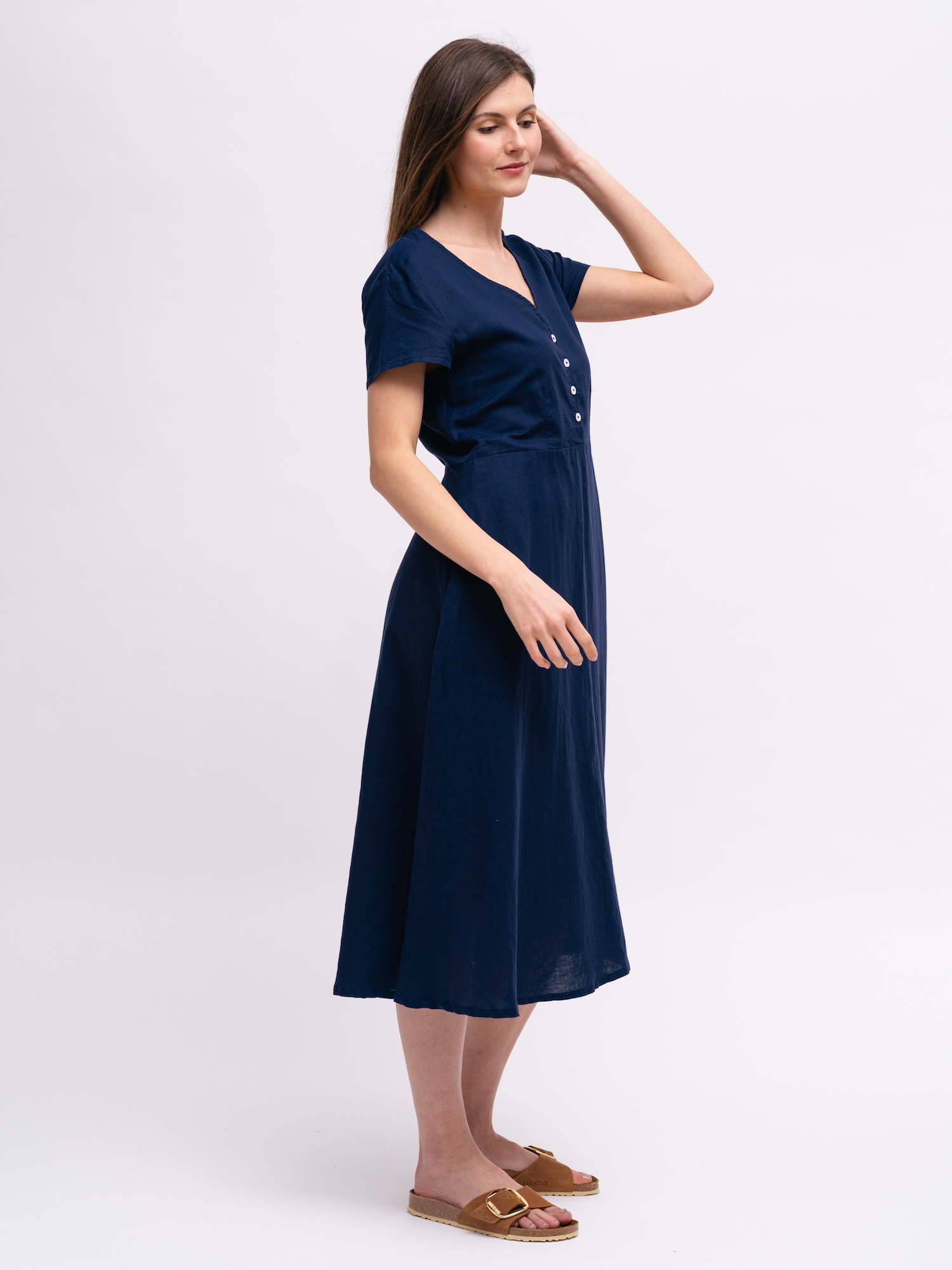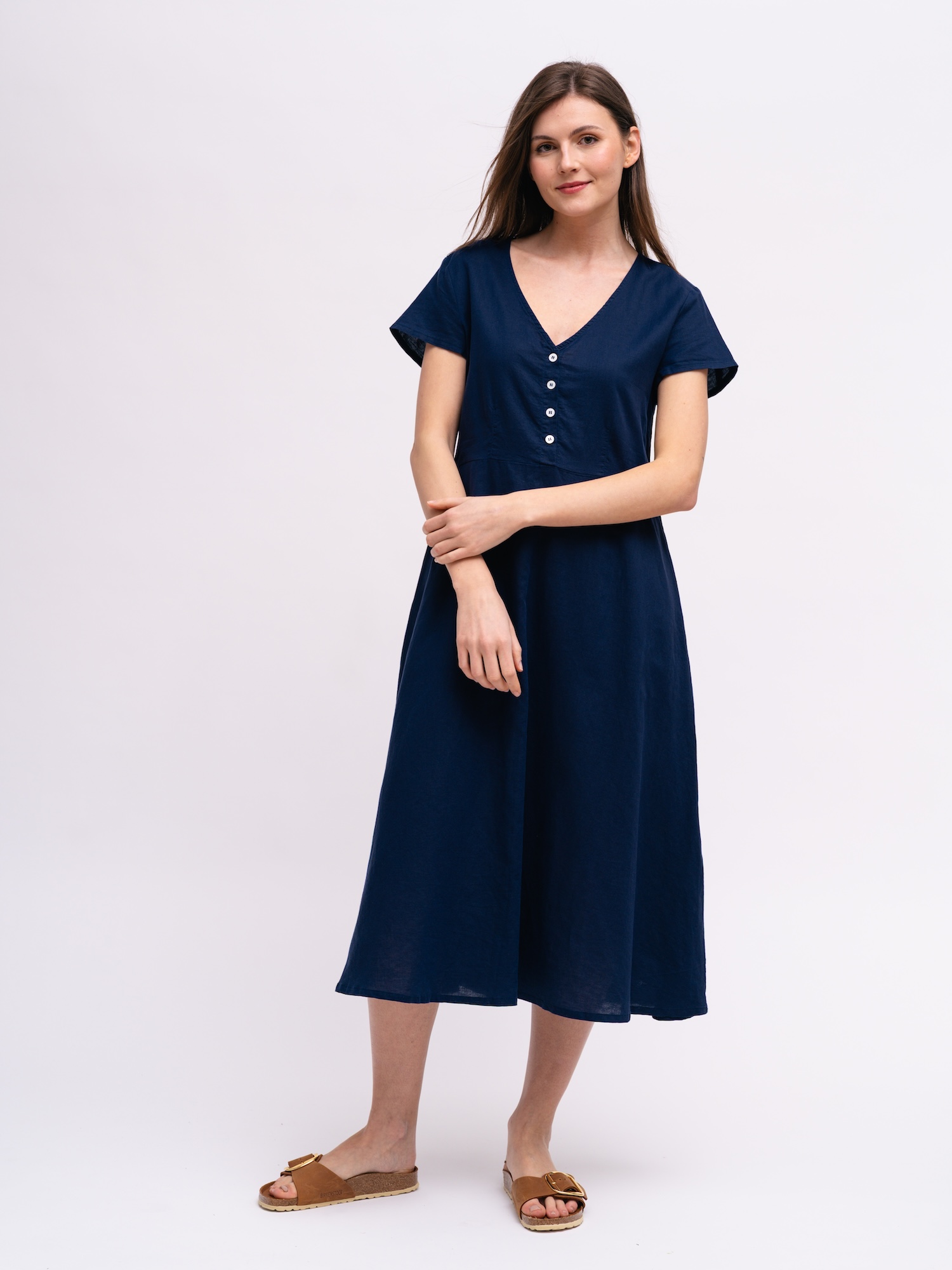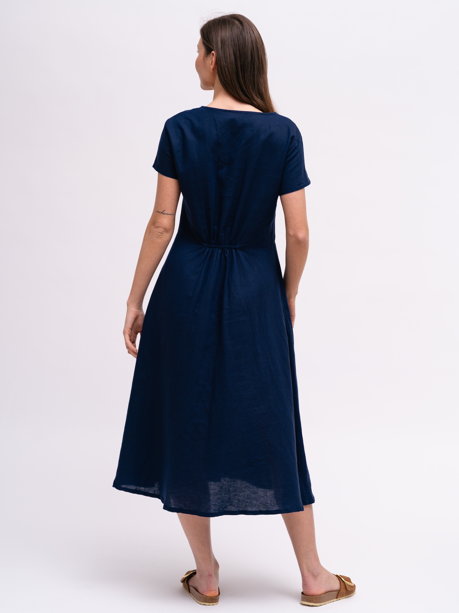 Granatowy odcień wnosi do garderoby klasyczny, stonowany charakter. Prosty fason sprawia, że sukienka świetnie łączy się z różnymi dodatkami.