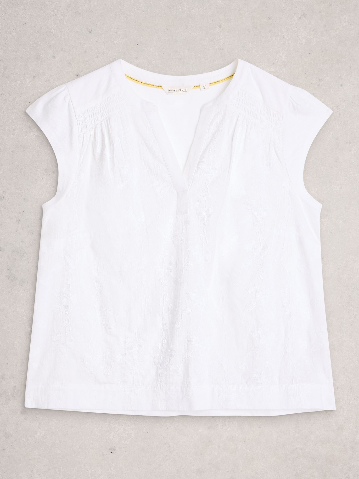 Biała wersja topu z haftowanymi motywami w subtelnym wydaniu. Zakładany przez głowę, bez zapięcia — lekki i wygodny dzięki klasycznemu krojowi.