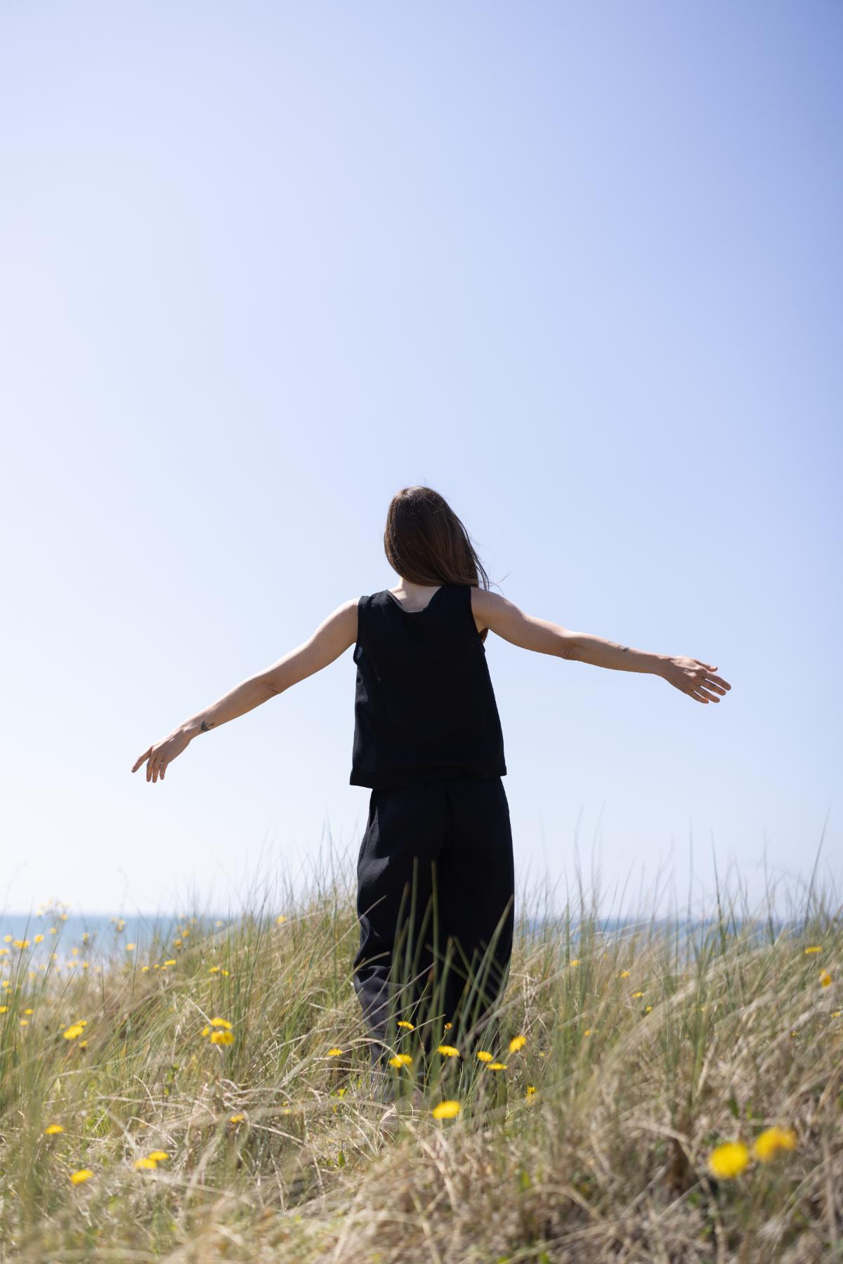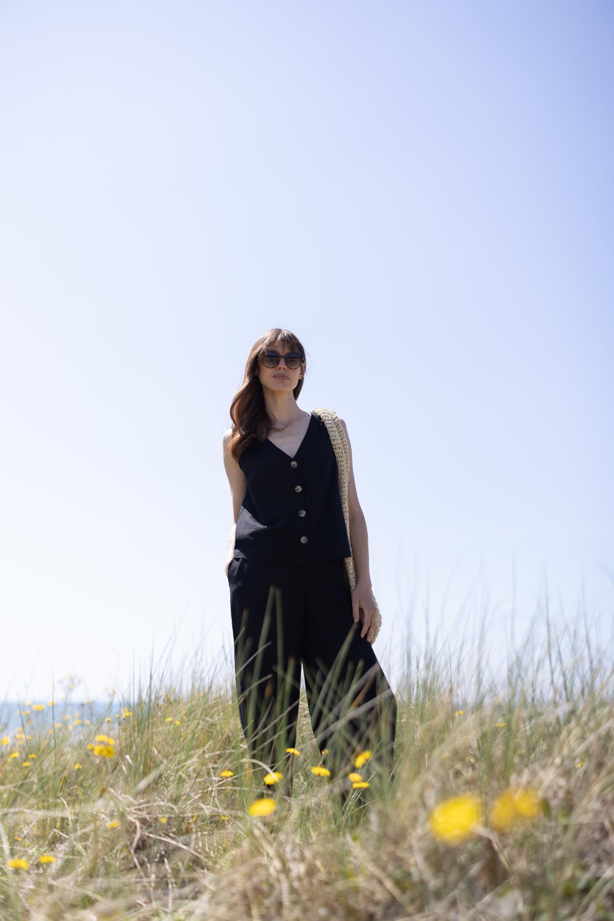 Czarny top z dekoltem w serek i guzikami ma minimalistyczny, letni charakter. Pasuje do szerokich spodni lub spódnicy i łatwo go wystylizować.