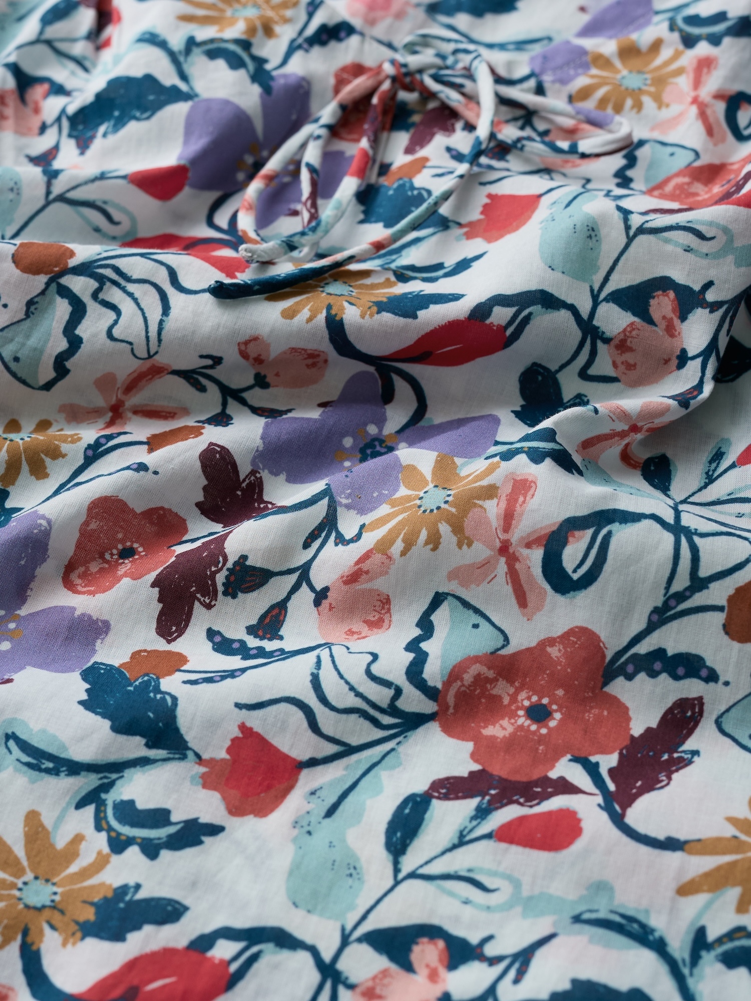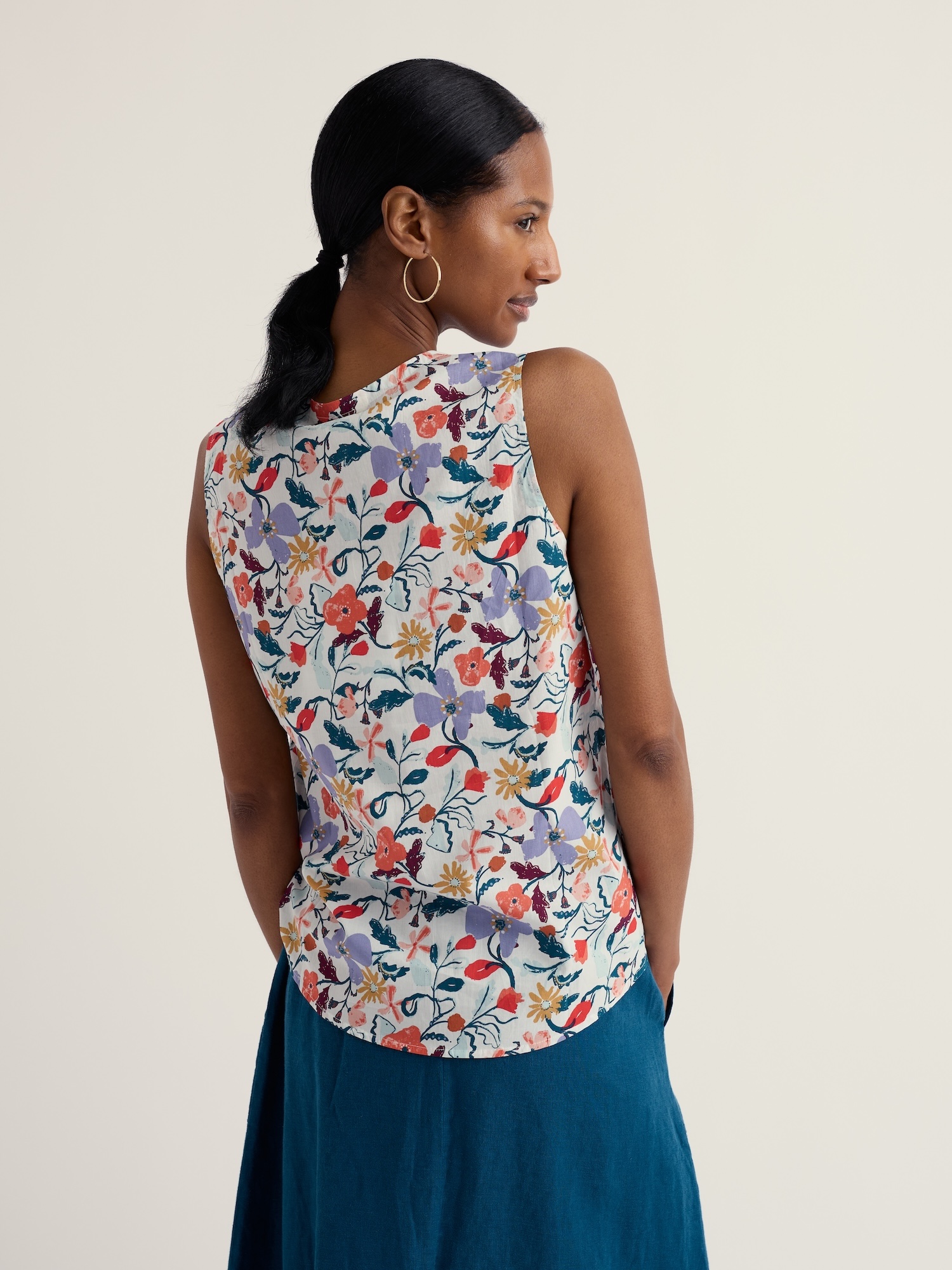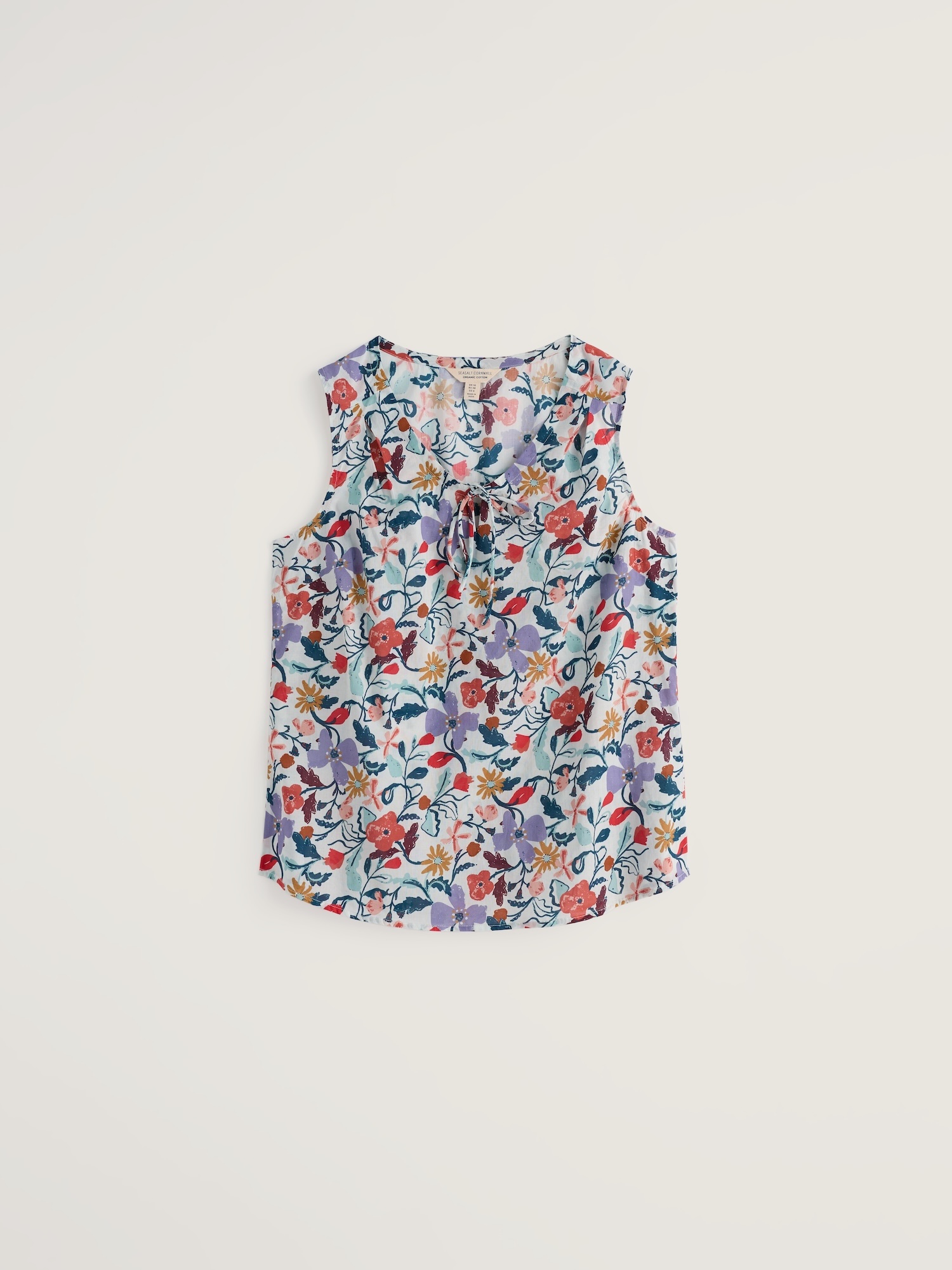 Luźny top z wiązaniem przy dekolcie wnosi letnią lekkość do stylizacji. Świetnie komponuje się z lnianymi spódnicami i ulubionymi dżinsami.