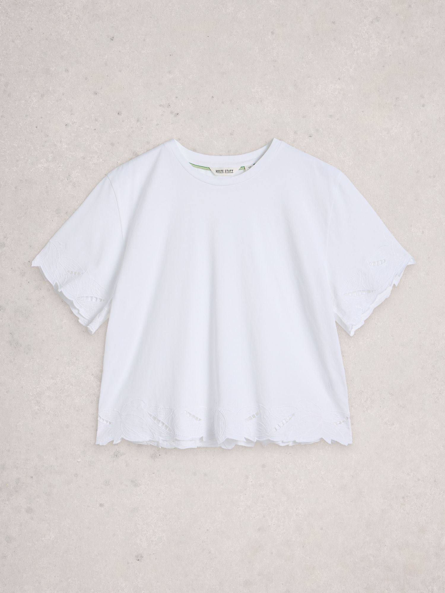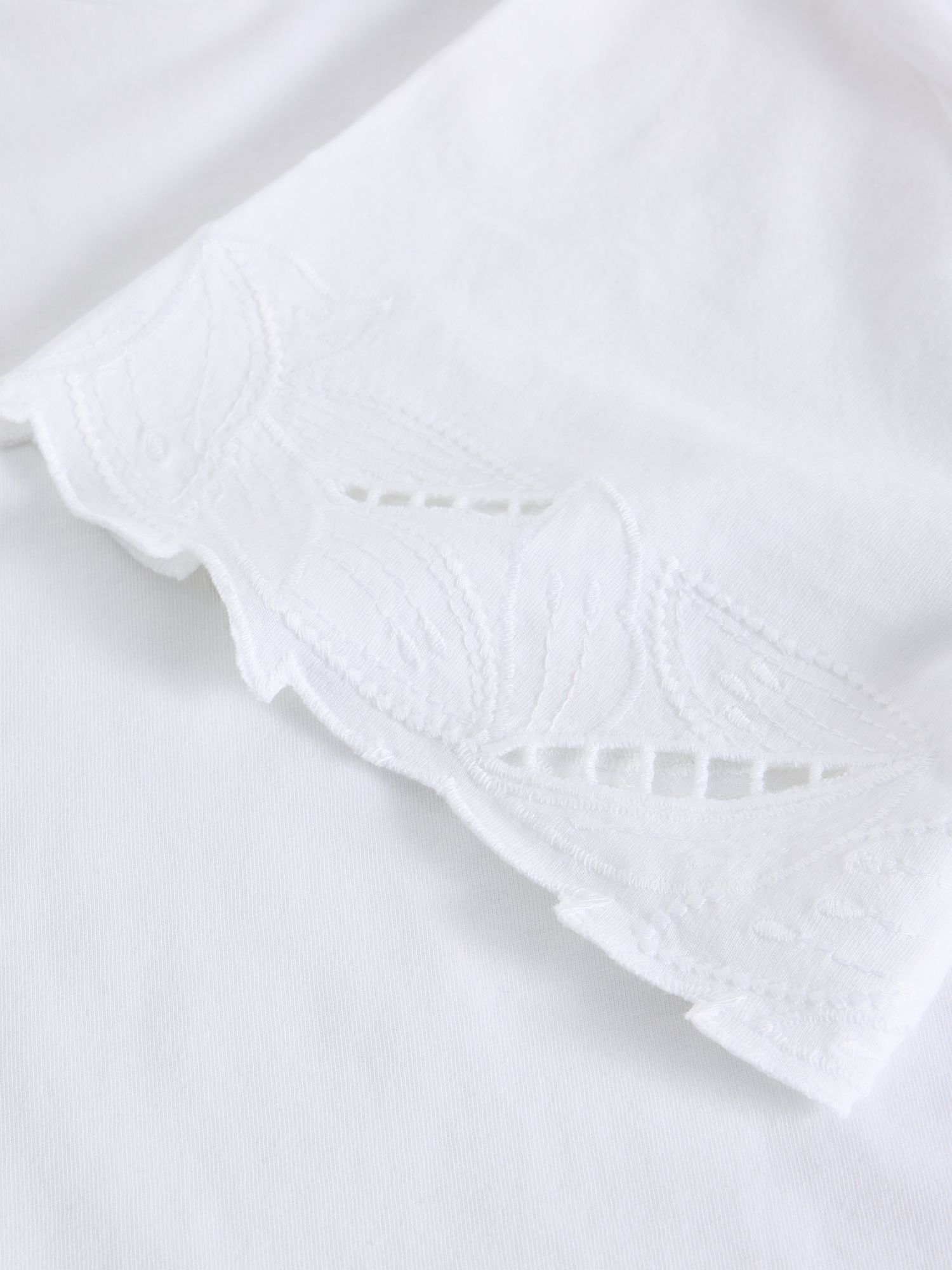 Prosty top z okrągłym dekoltem i ozdobnym wykończeniem cutwork. Luźny fason, lekko elastyczny jersey, wykonany w 100% z bawełny bio GOTS.