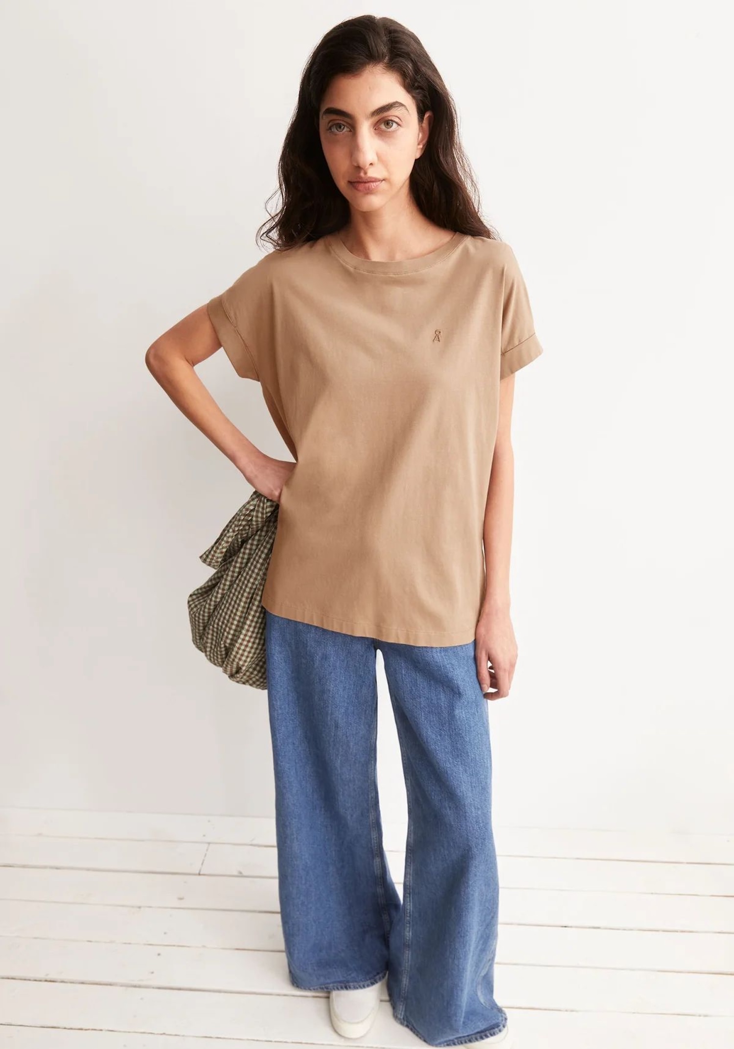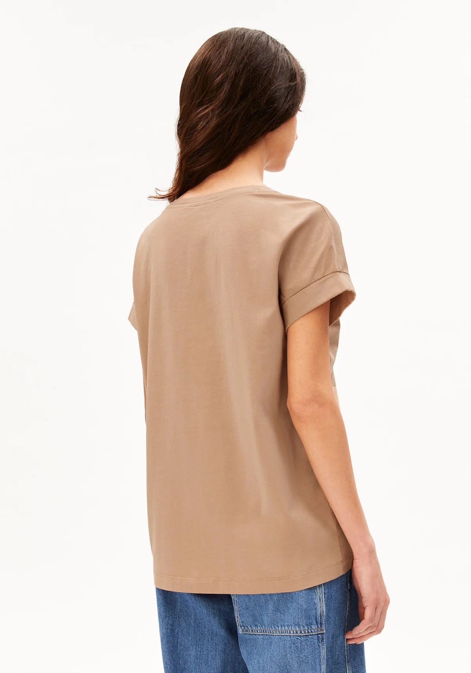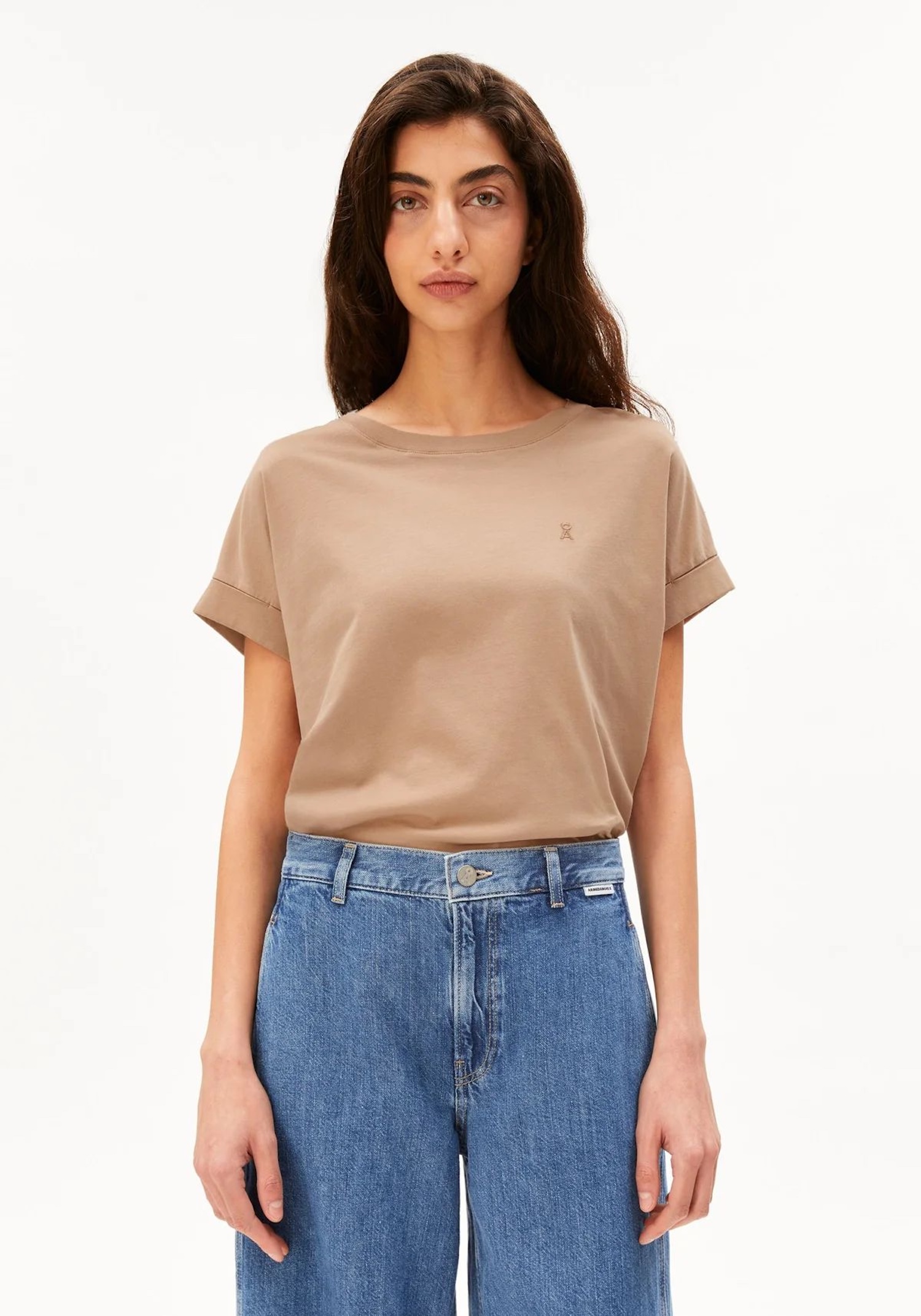Gładki top w odcieniu camel — idealny jako baza do warstwowania. Bawełna organiczna oddycha i zapewnia komfort przez cały dzień.