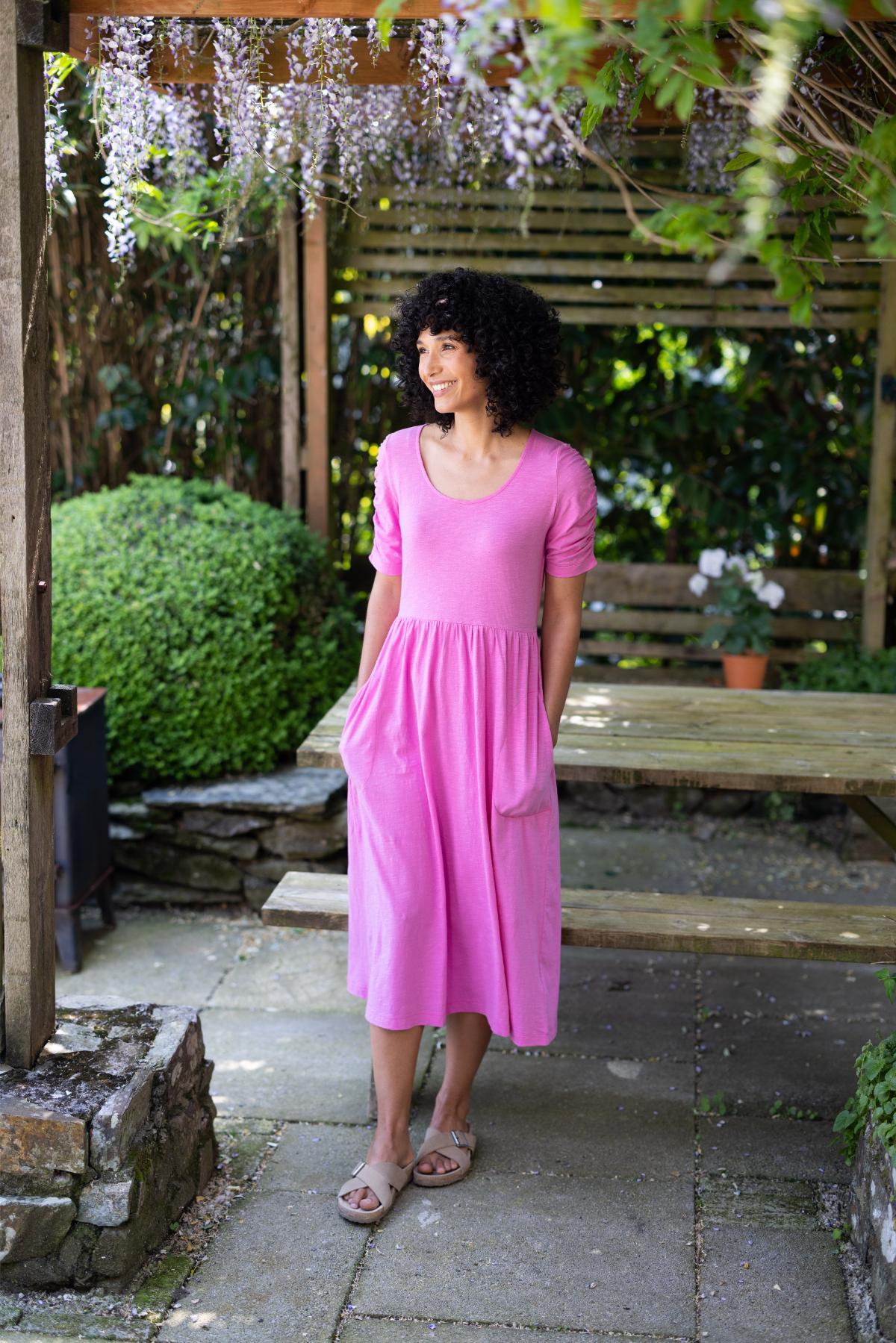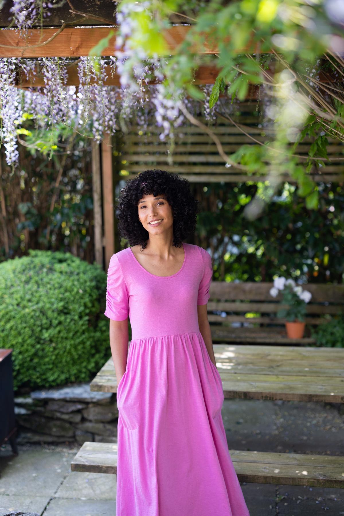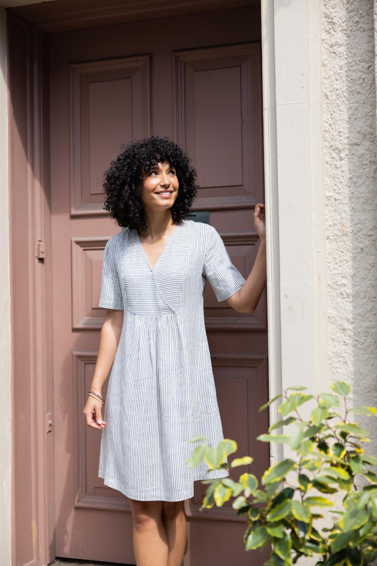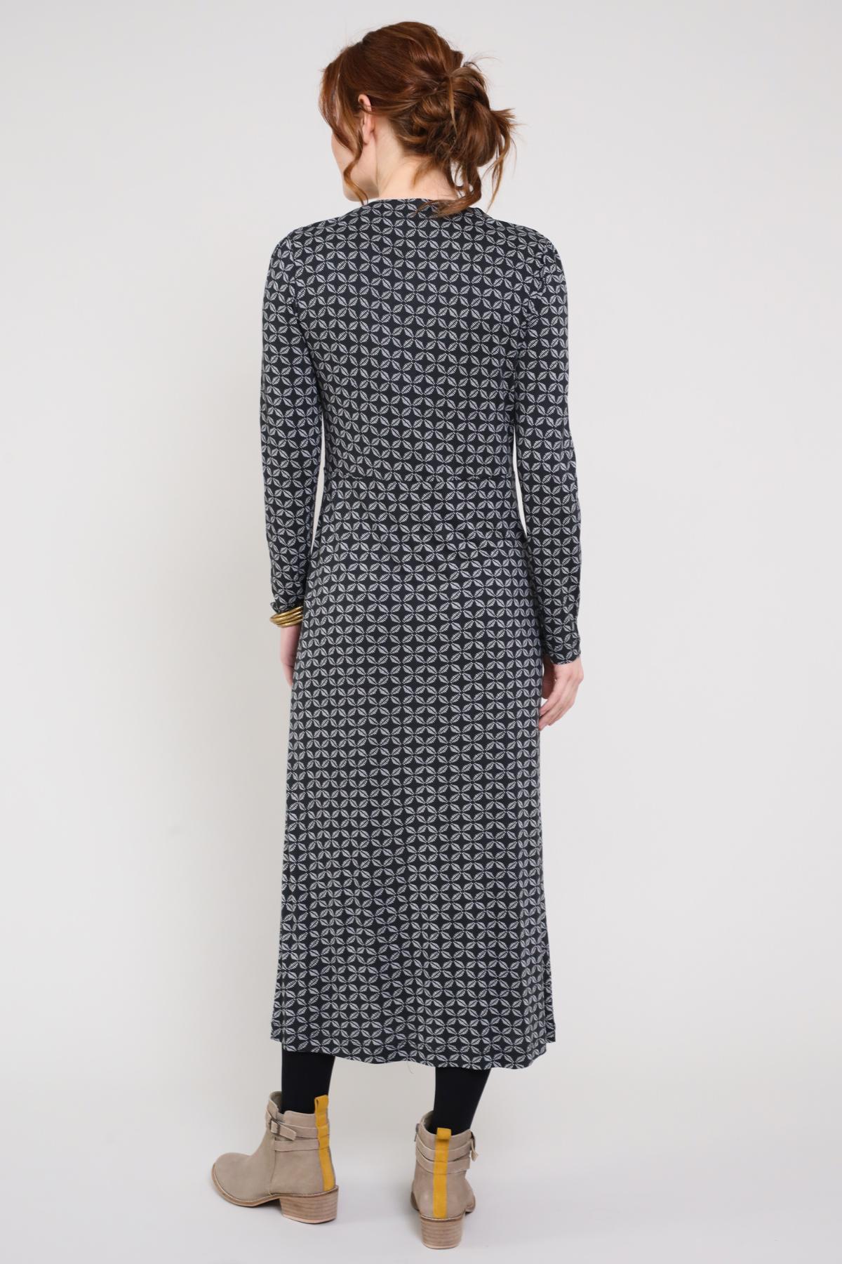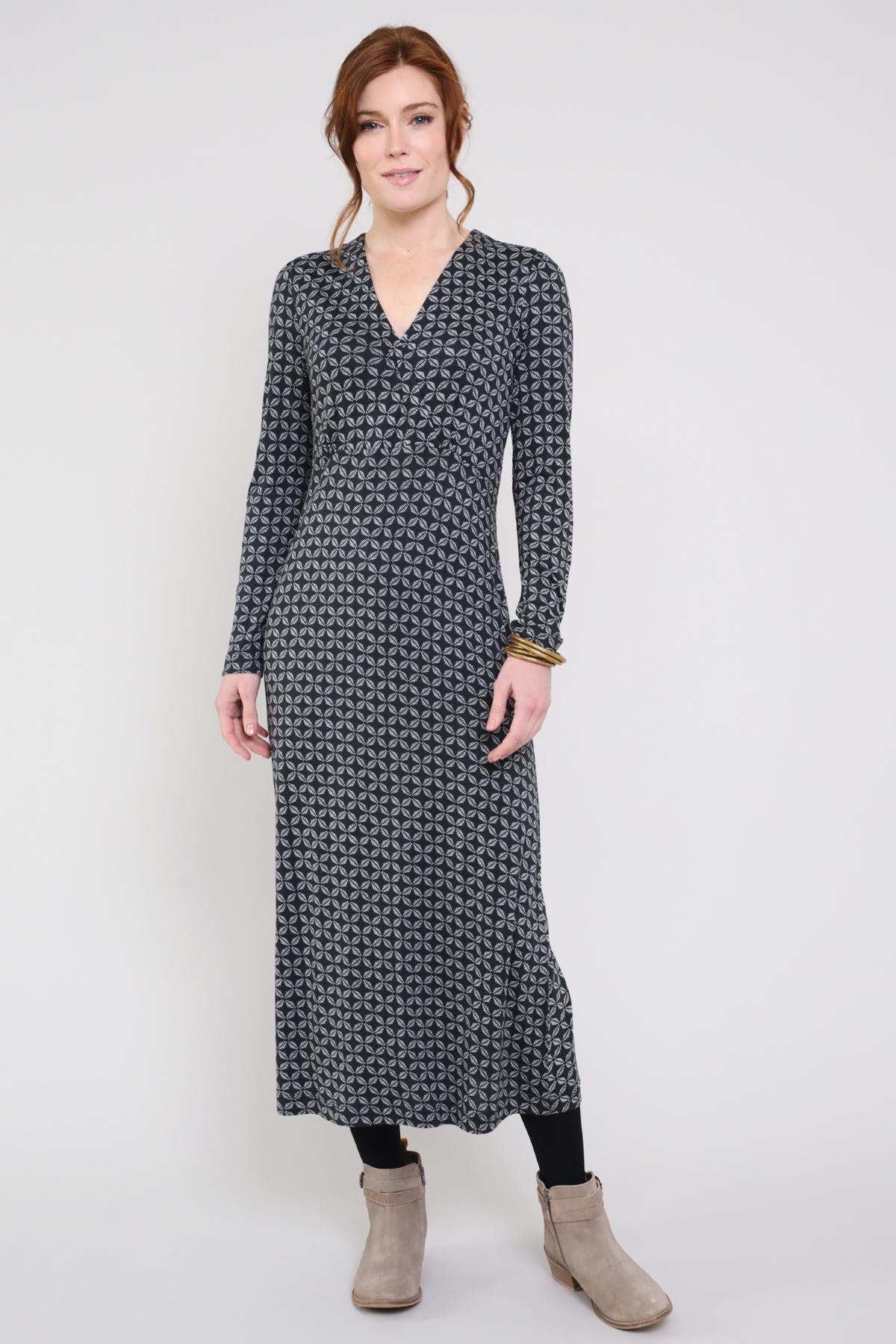 Sukienka maxi z dyskretnym wzorem — odpowiednia na uroczystości i do miasta. Kopertowy dekolt i wyższe cięcie w talii optycznie wydłużają sylwetkę.
