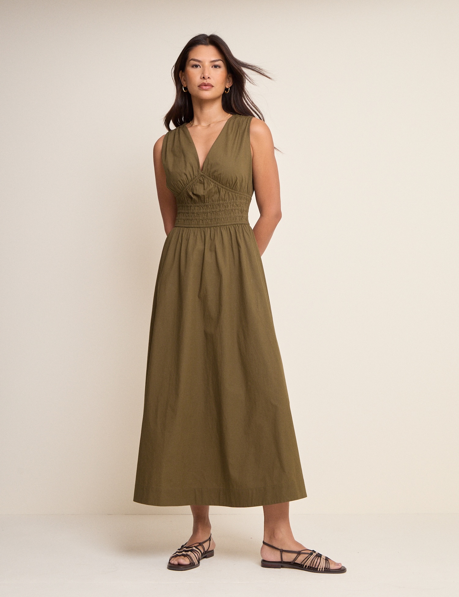 Lekka sukienka maxi w oliwkowym odcieniu ma dopasowany gorset i rozkloszowany dół, pasuje na codzienne i eleganckie wyjścia. Uszyta ze 100% bawełny, nosi się wygodnie i wygląda elegancko.