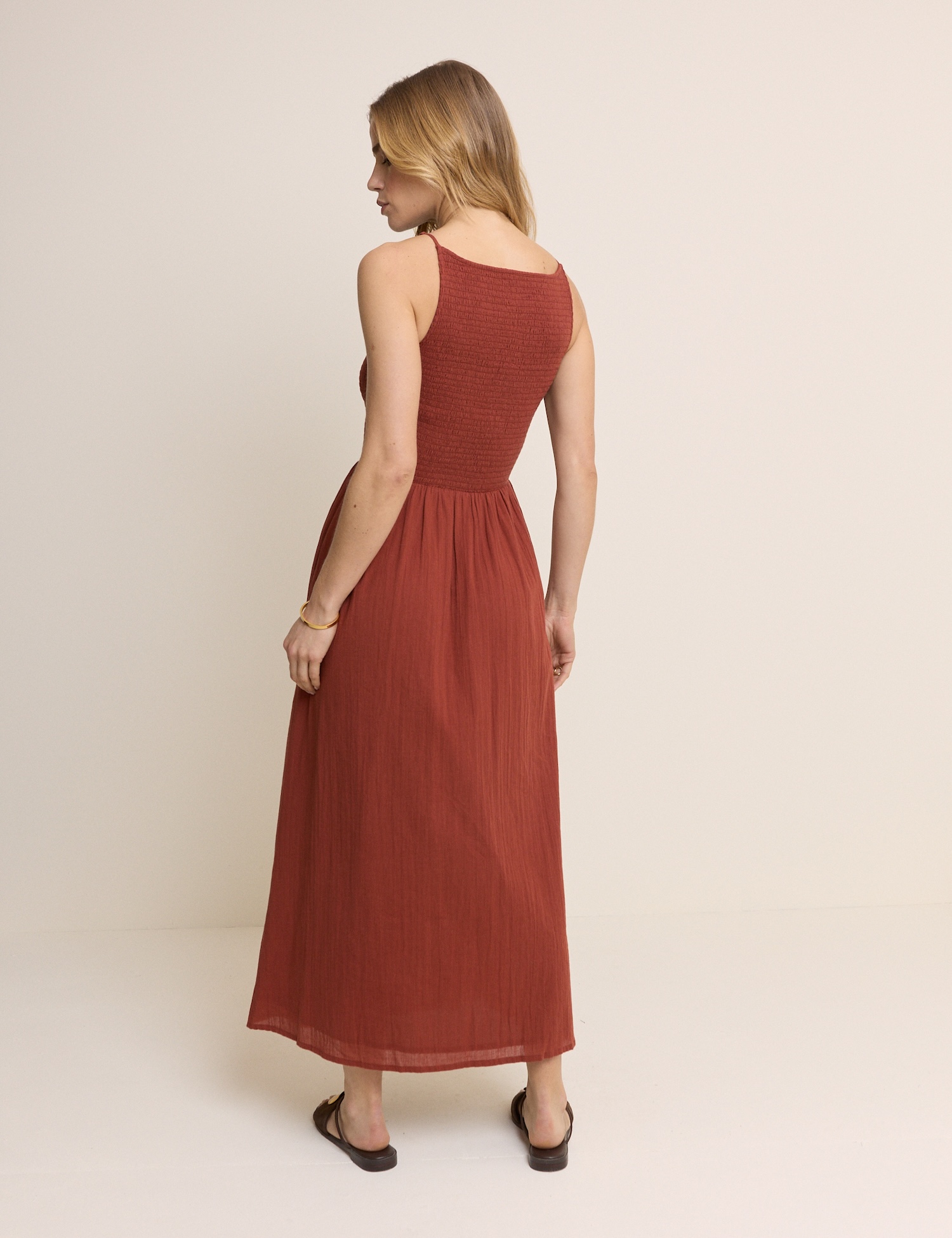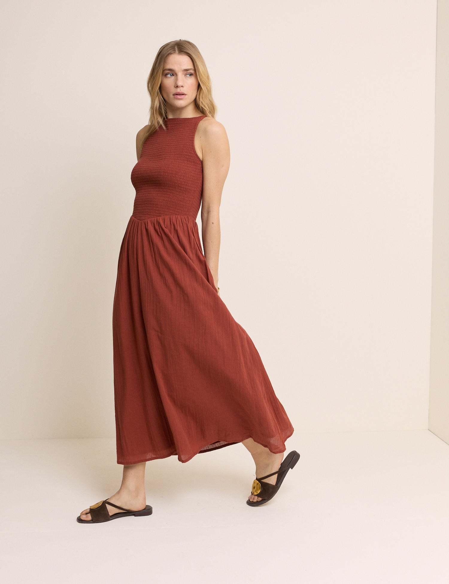 Maxi sukienka w ciepłym ceglastym odcieniu łączy elegancję z komfortem. Sprawdzi się na co dzień i podczas letnich spotkań.