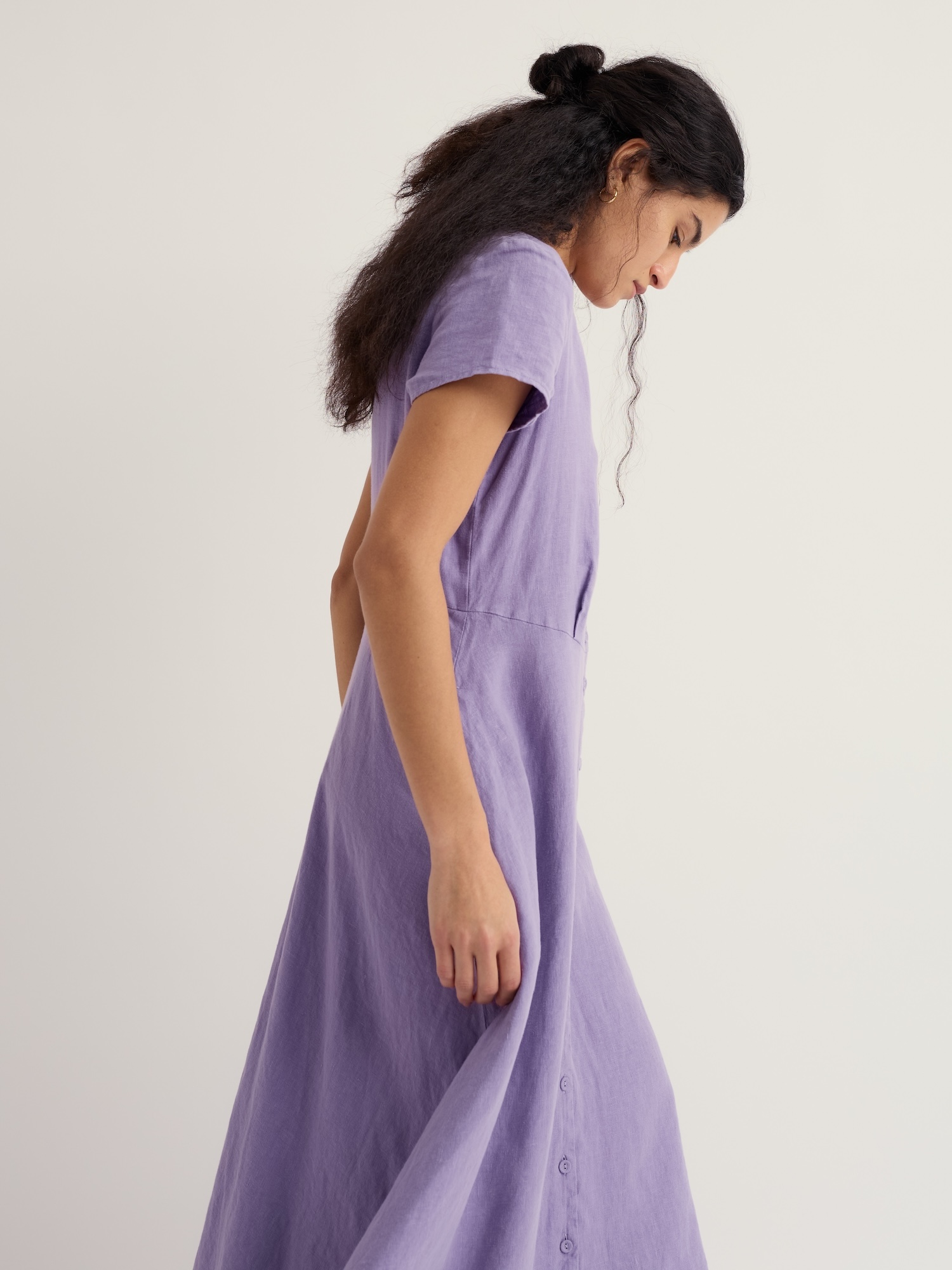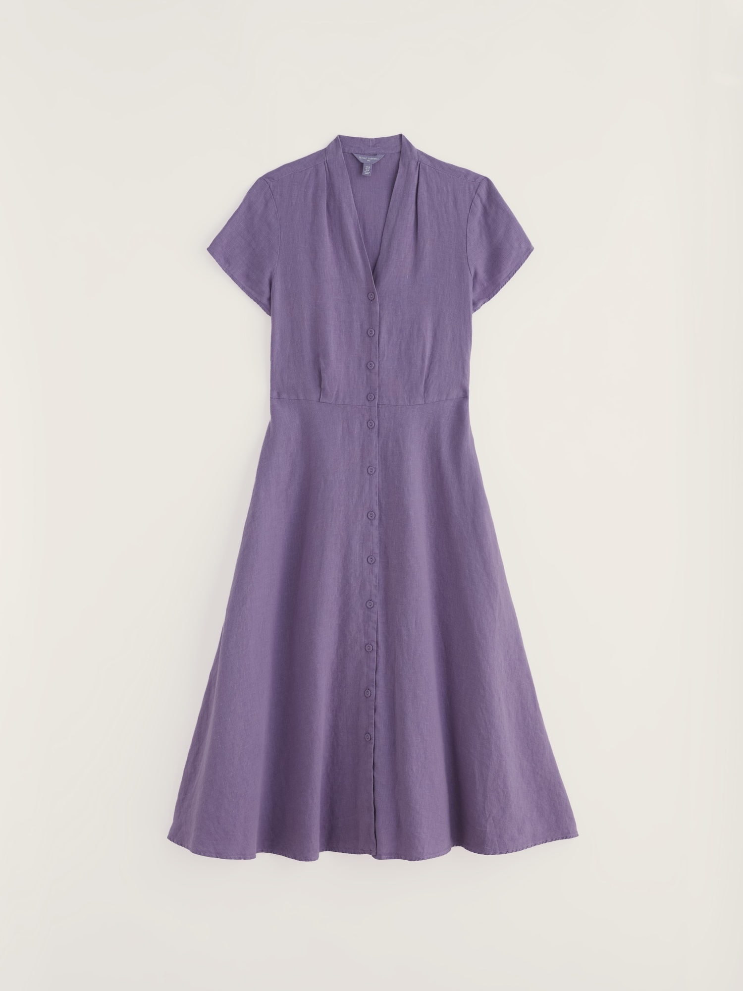 Lniana sukienka w kroju A z dekoltem w serek jest lekka i przewiewna. Bez podszewki i z kieszeniami sprawdzi się podczas pikników i letnich kolacji.