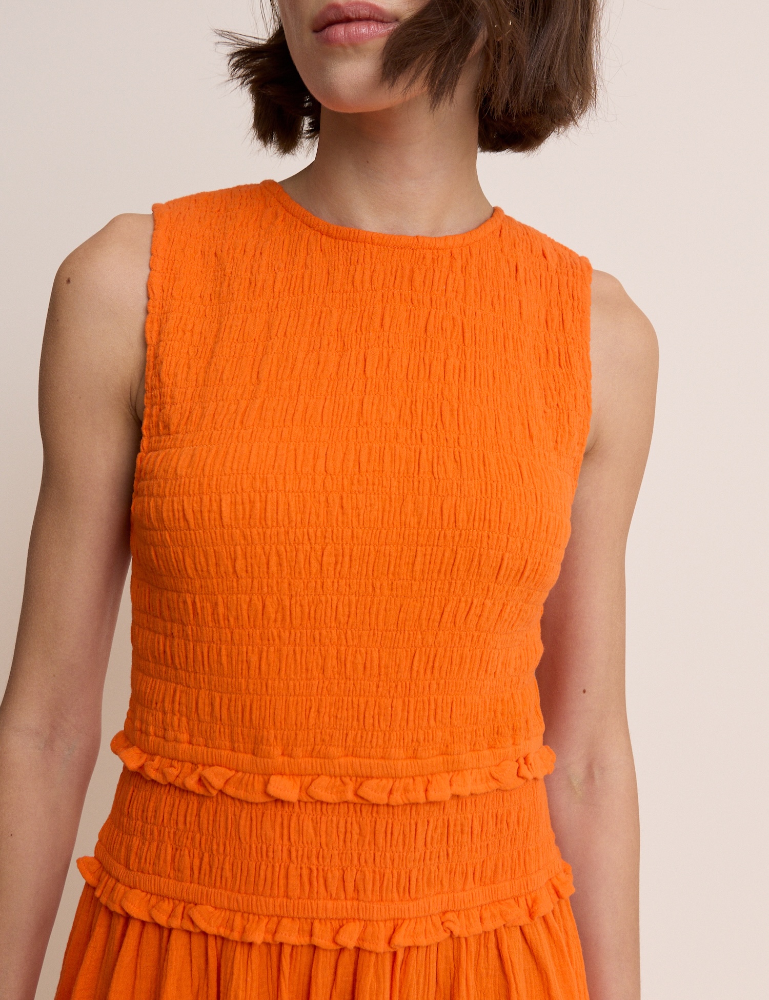 Lekka sukienka w intensywnym pomarańczowym odcieniu o prostym kroju wygląda schludnie. Sprawdza się na letnie dni i niezobowiązujące spotkania.
