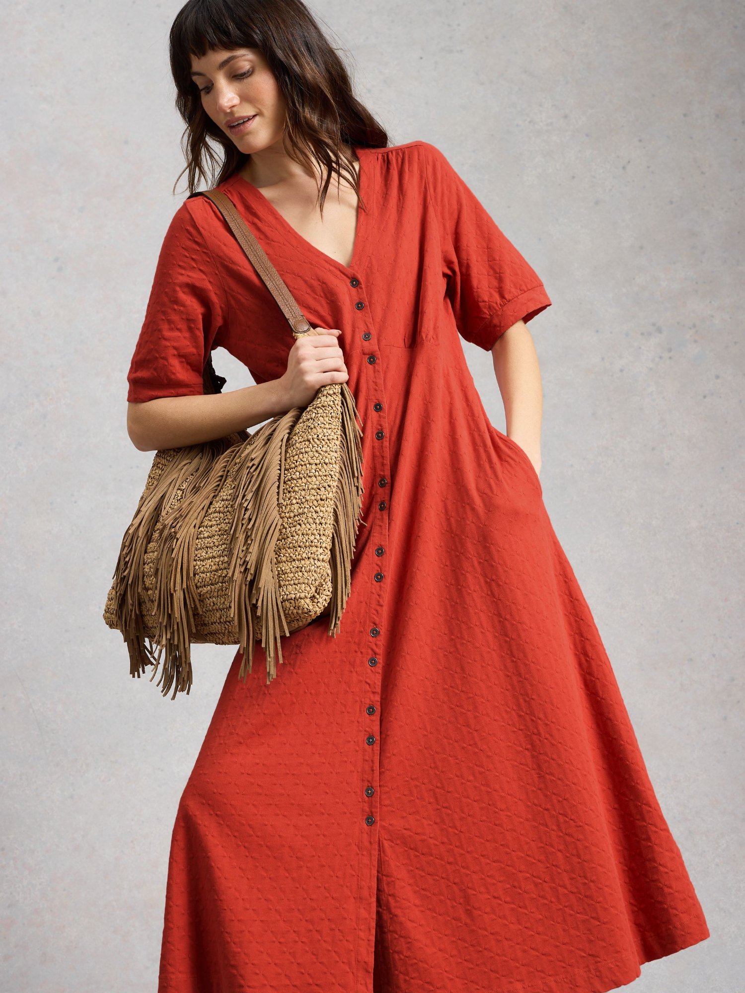 Lekka sukienka o kroju empire z dekoltem w serek i wyrazistym wzorem. Sprawdzi się w mieście i podczas weekendów, a praktyczne boczne kieszenie dodają jej funkcjonalności.