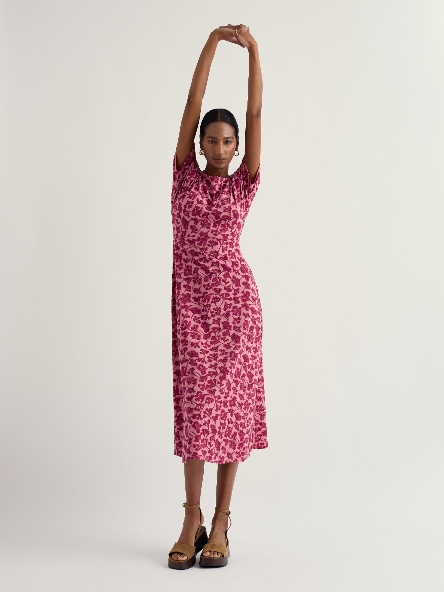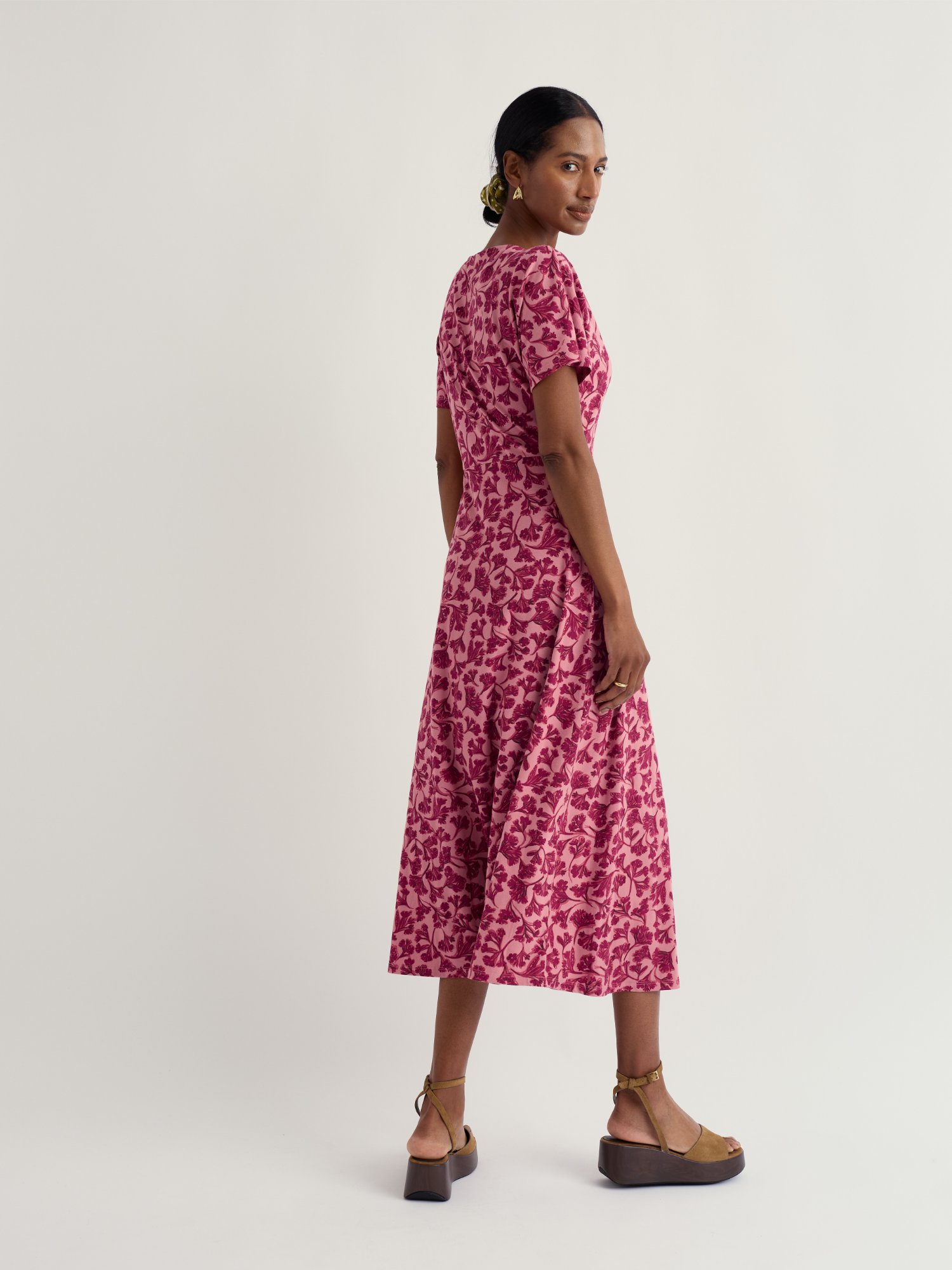 Dopasowana sukienka z jerseyu w subtelny kwiatowy wzór podkreśla talię. Sprawdzi się na co dzień i podczas popołudniowych spotkań.