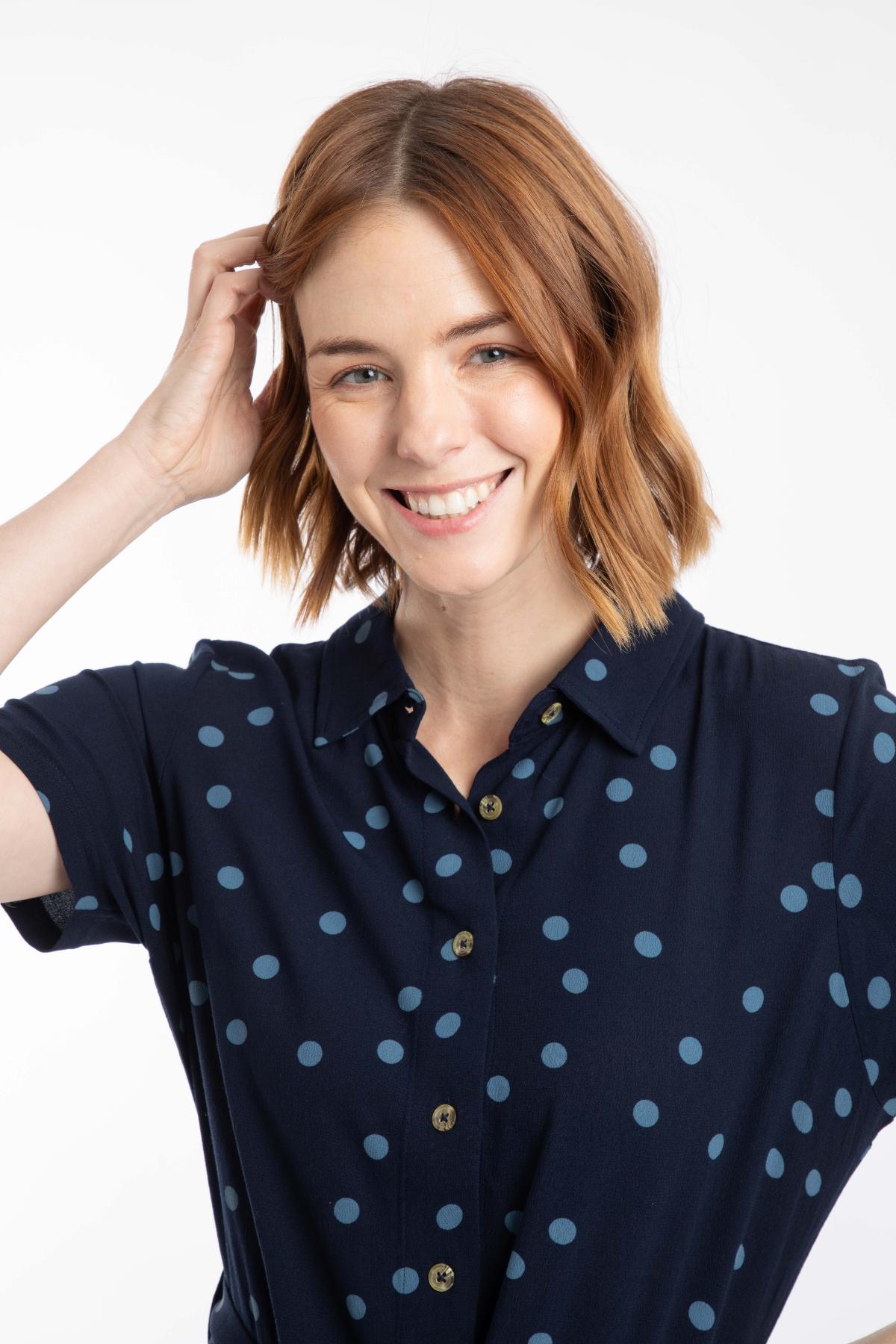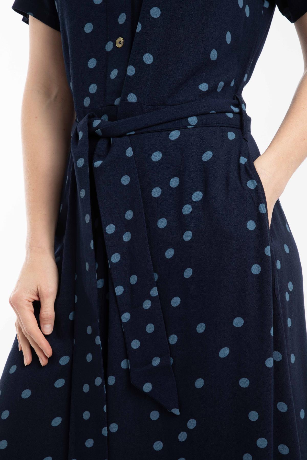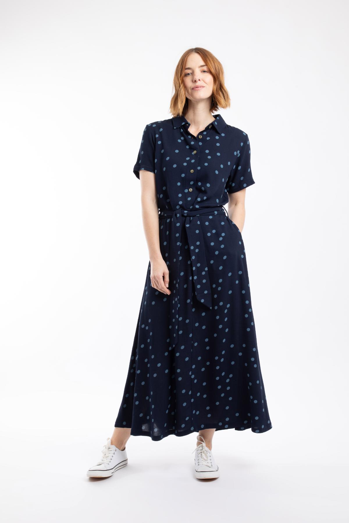 Koszulowa sukienka w granatowym kolorze z kropkami sprawdzi się w biurze i na kolacji. Wiskoza Ecovero układa się lekko i elegancko.