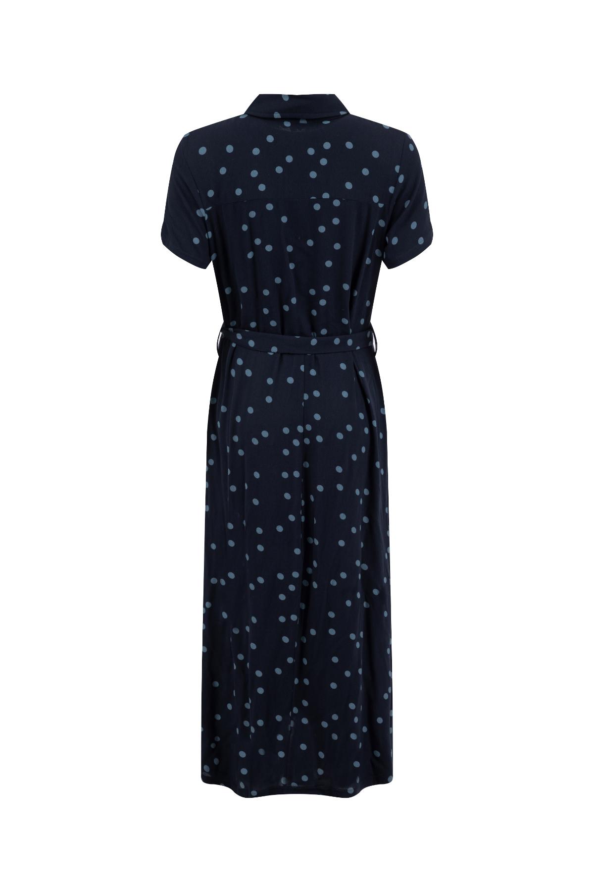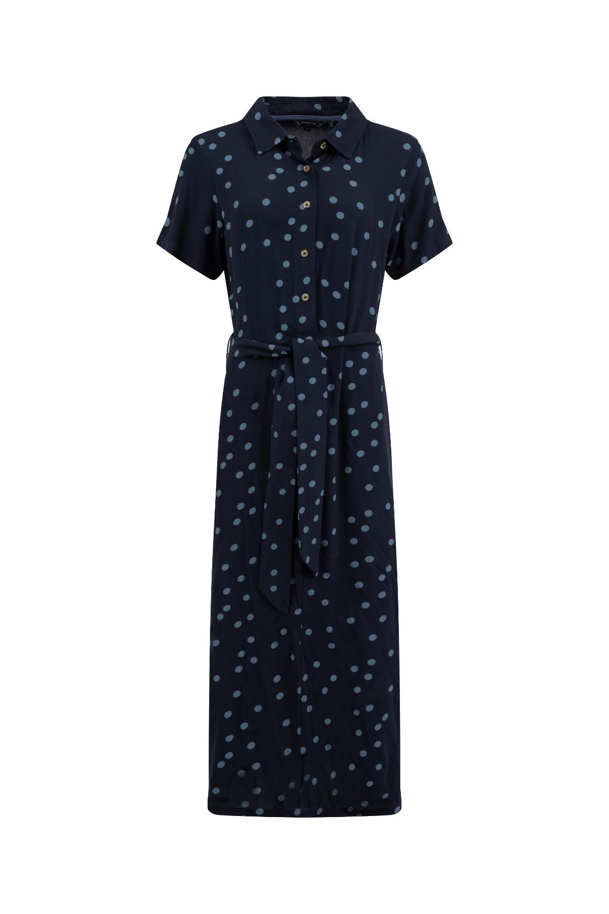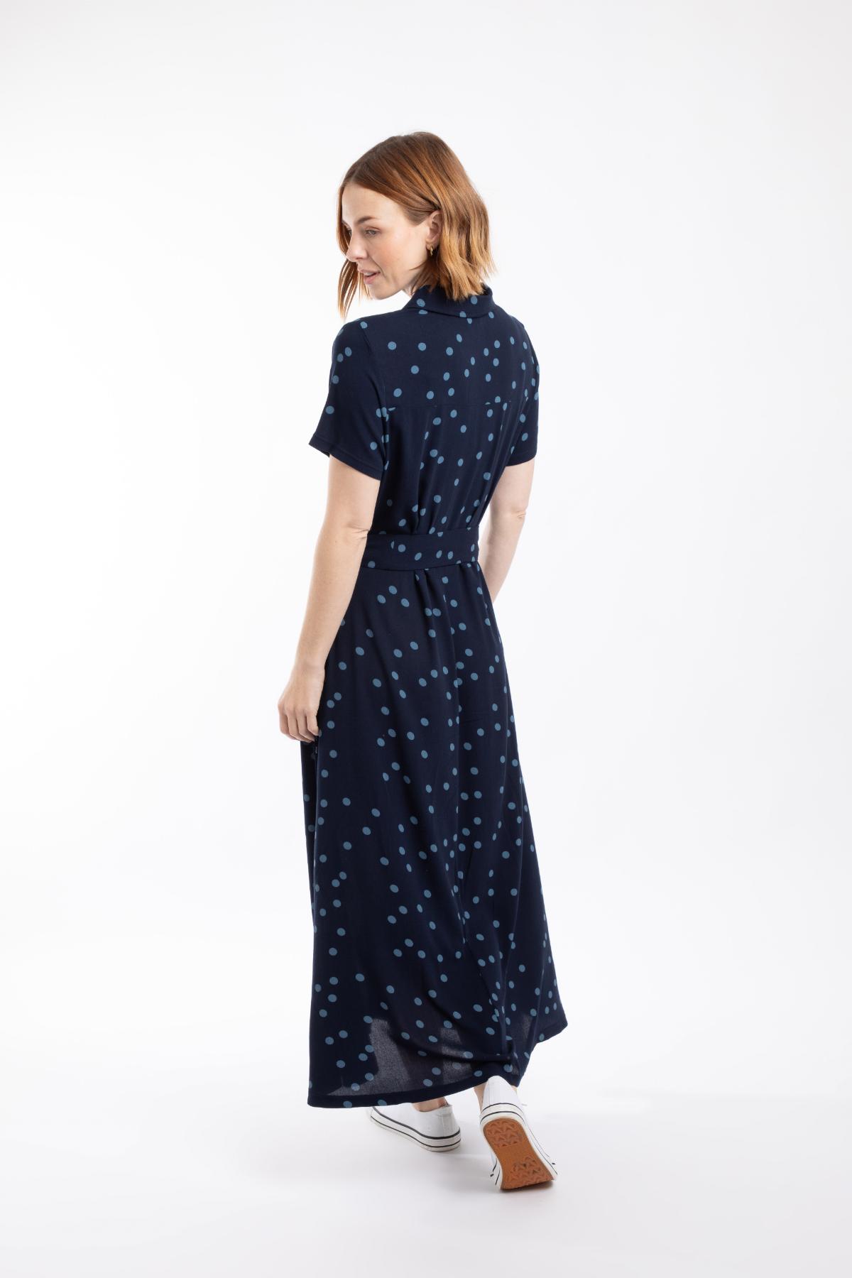 Koszulowa sukienka w granatowym kolorze z kropkami sprawdzi się w biurze i na kolacji. Wiskoza Ecovero układa się lekko i elegancko.