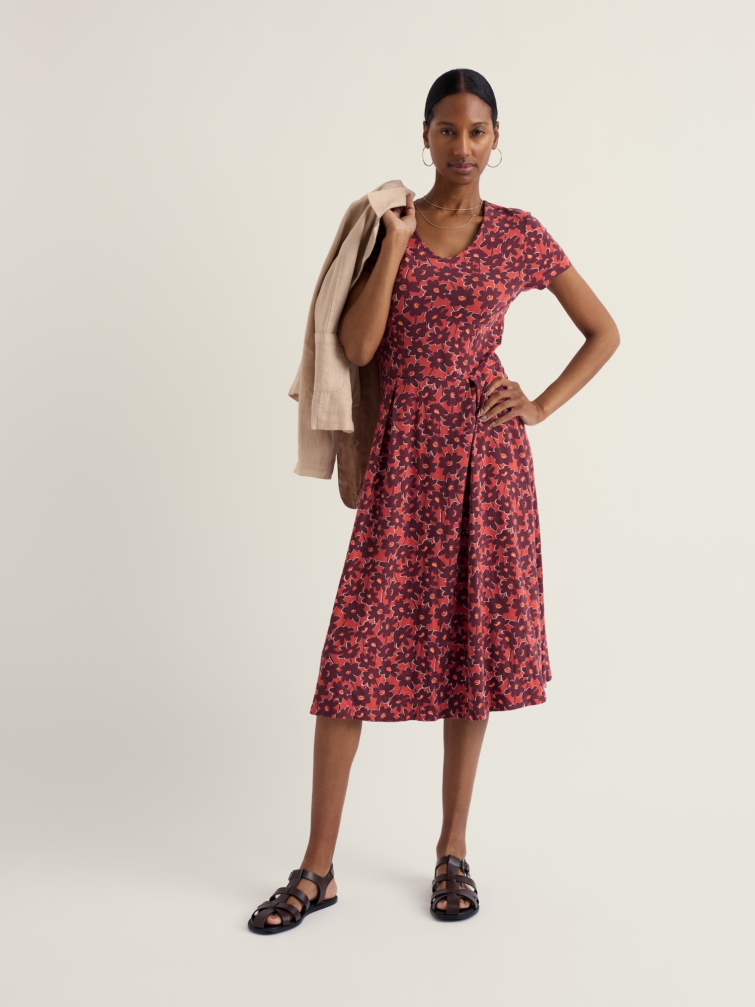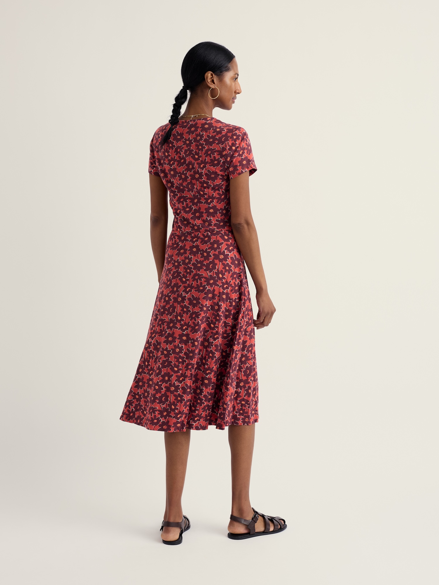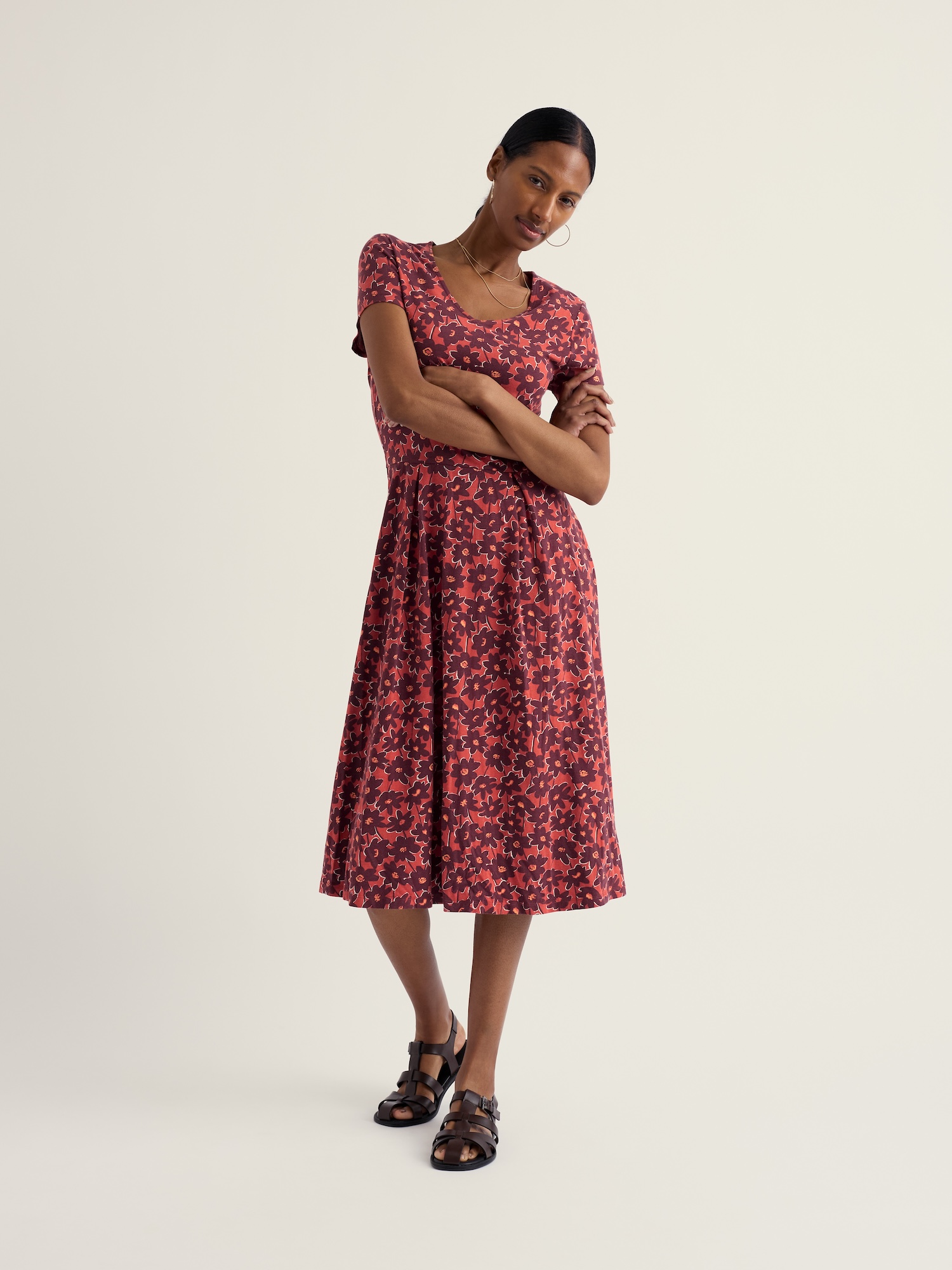 Delikatnie dopasowana sukienka w ciepłe, kwiatowe barwy — idealna na co dzień i weekendowe wyjścia. Rozkloszowany dół podkreśla talię, a całość wygląda zwiewnie i schludnie.