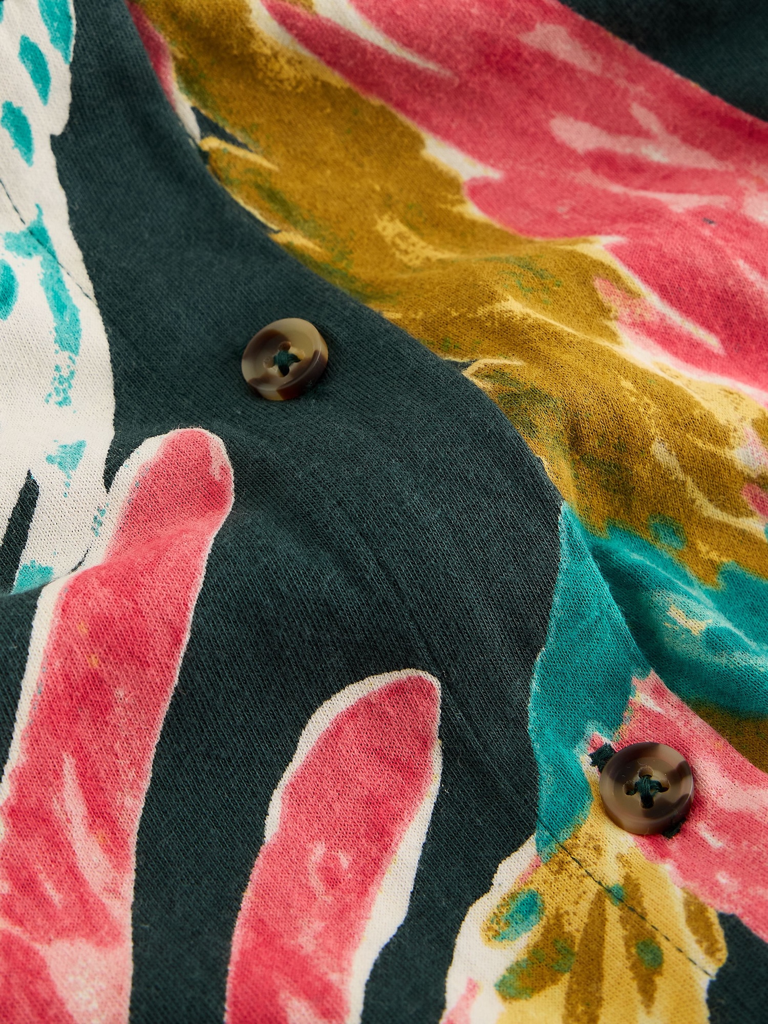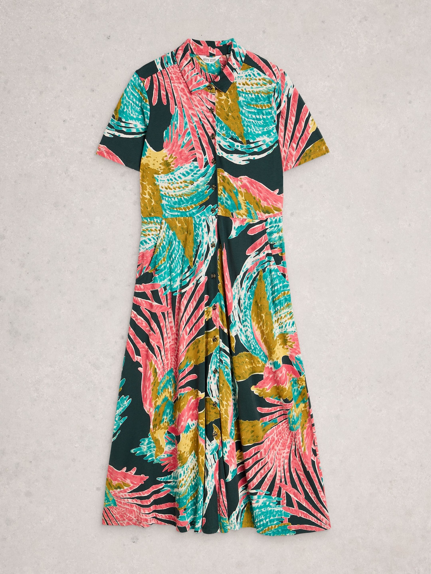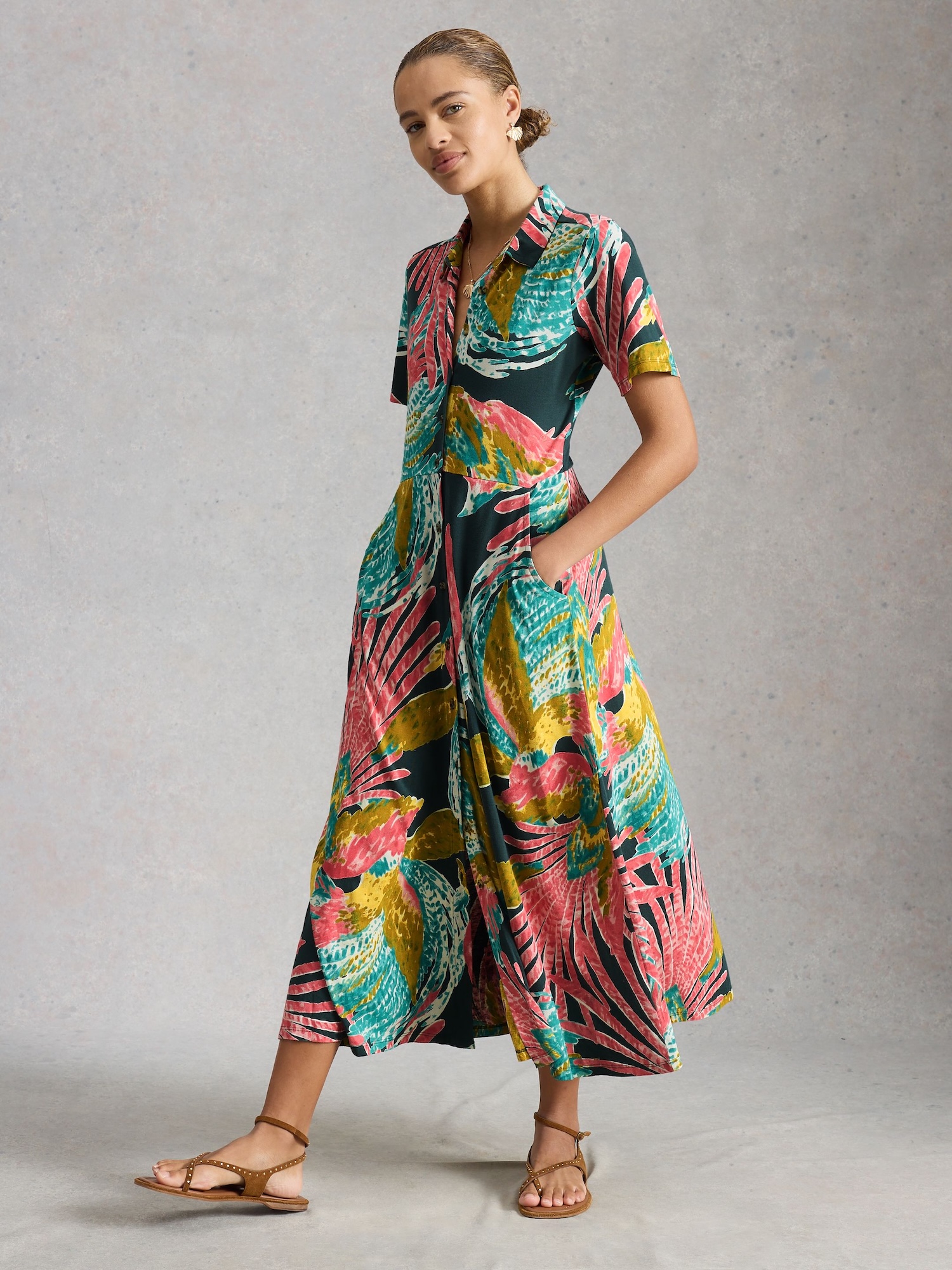 Wyrazisty tropikalny wzór w intensywnych odcieniach różu, zieleni i żółci nadaje sukience energii. Koszulowy fason z kołnierzykiem i rozkloszowanym dołem tworzy swobodną sylwetkę.
