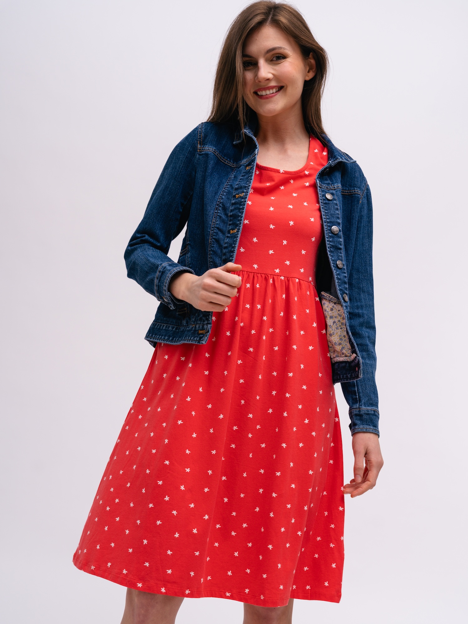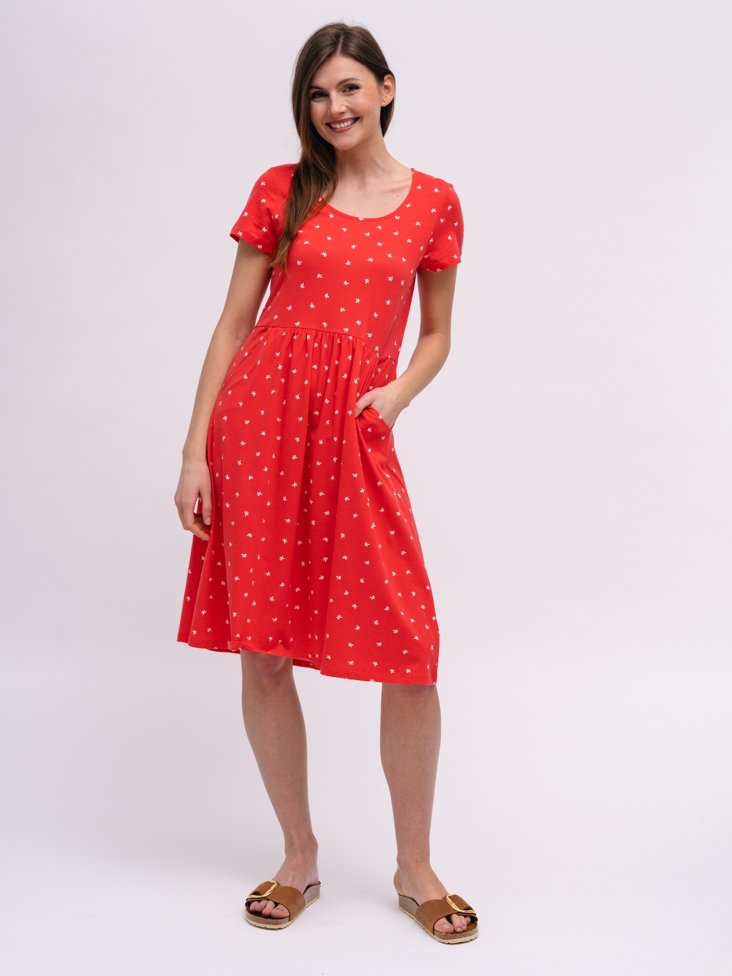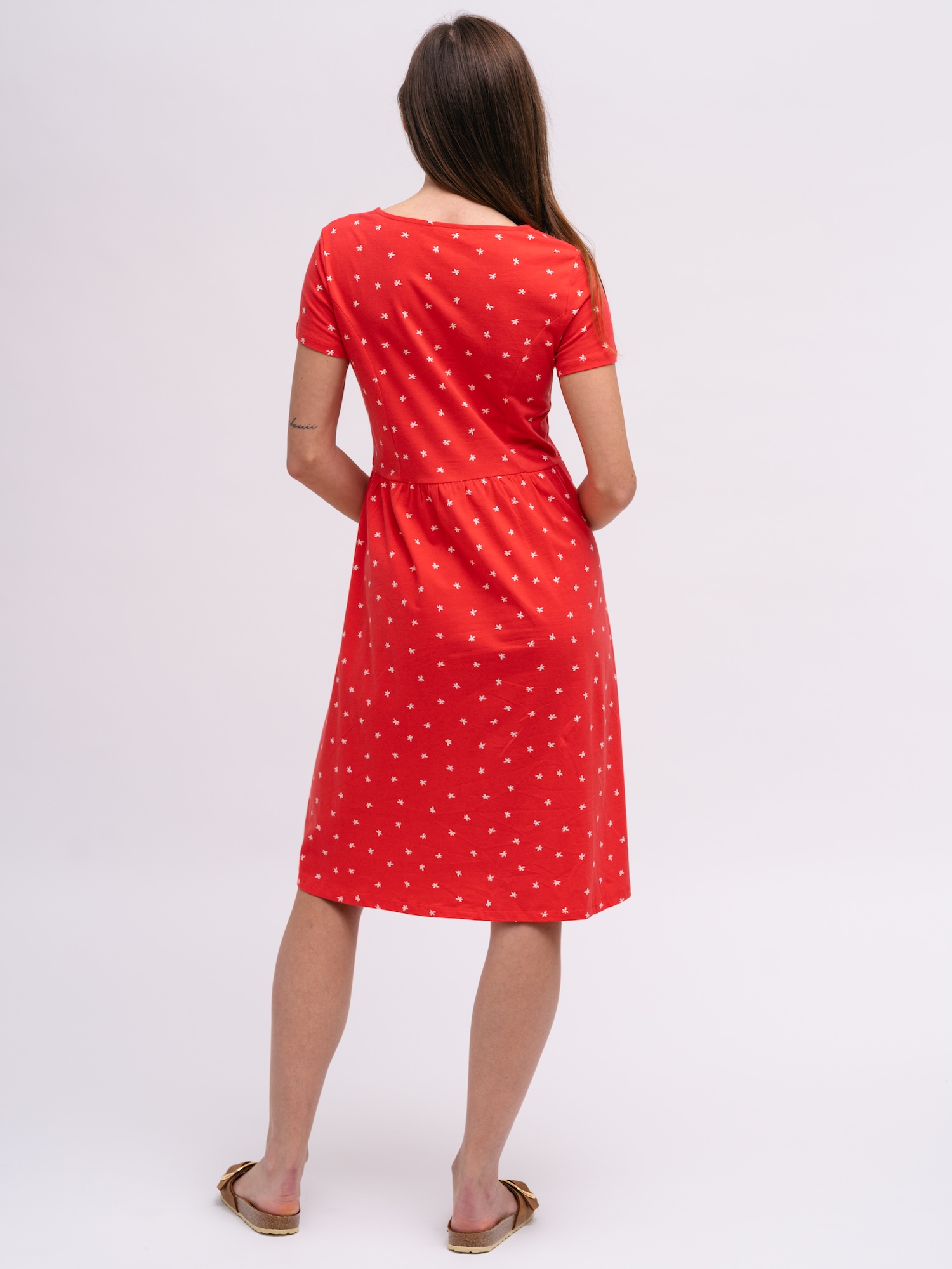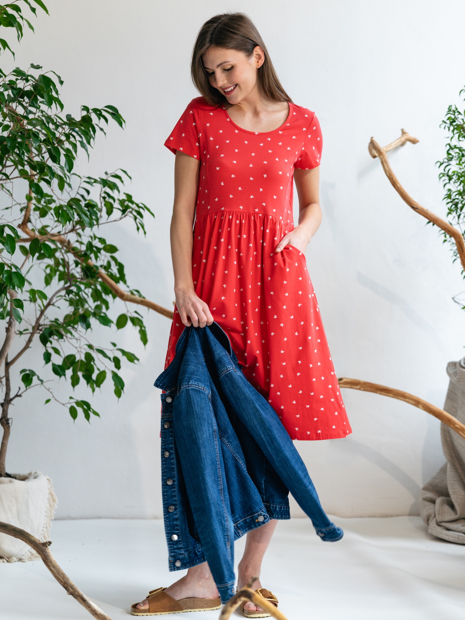 Lekka sukienka z drobnym kwiatowym nadrukiem, idealna na letnie spacery i przystanki w mieście. Miękki jersey z organicznej bawełny zapewnia wygodę przez cały dzień.