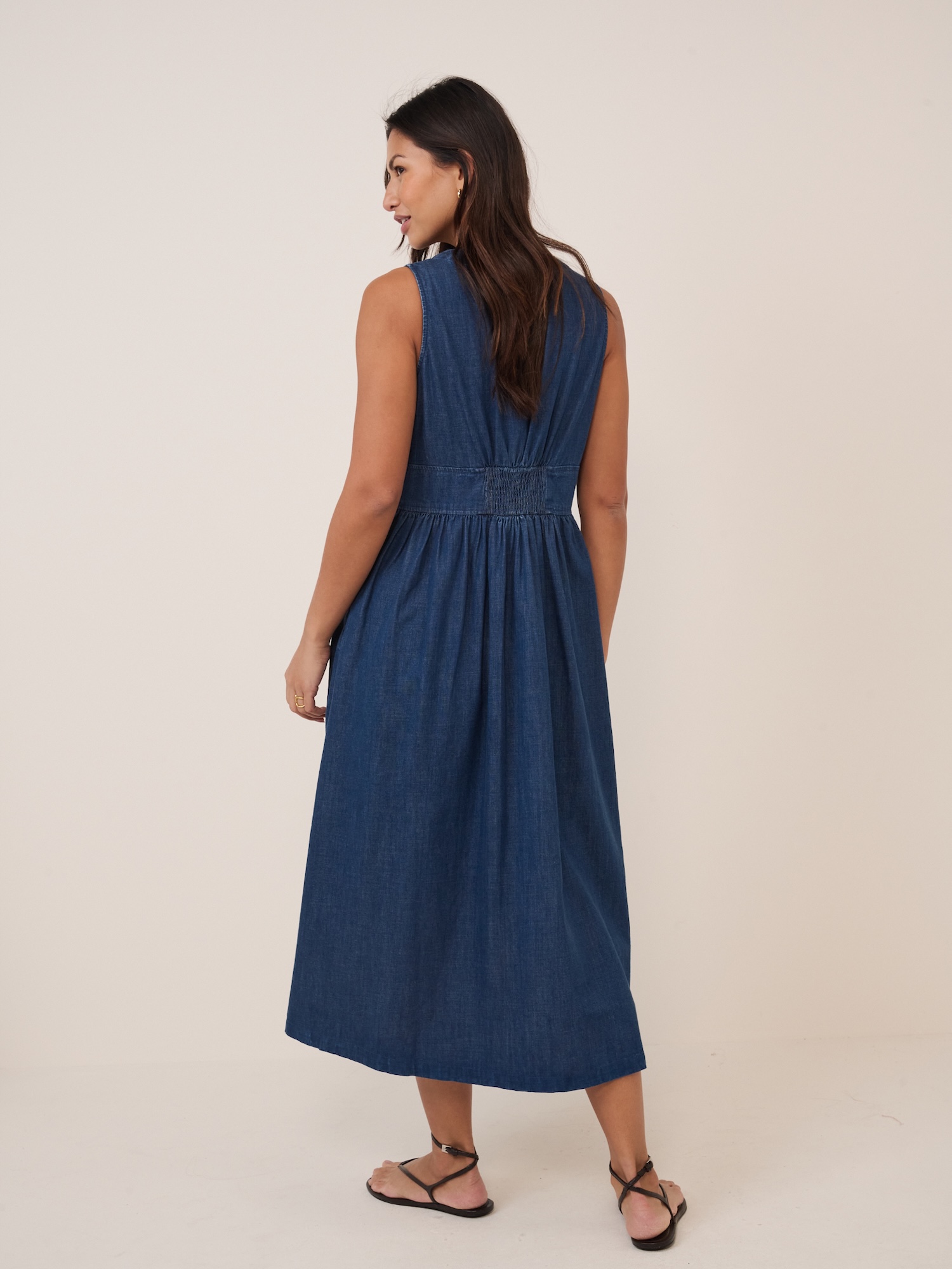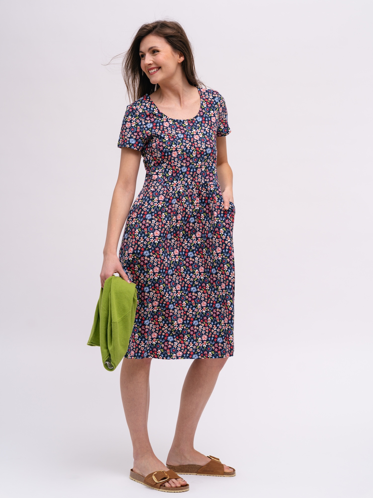 Sukienka z 100% bawełny o długości midi zapewnia naturalny komfort. Klasyczny fason z dekoltem w serek sprawdza się na co dzień i w weekend.