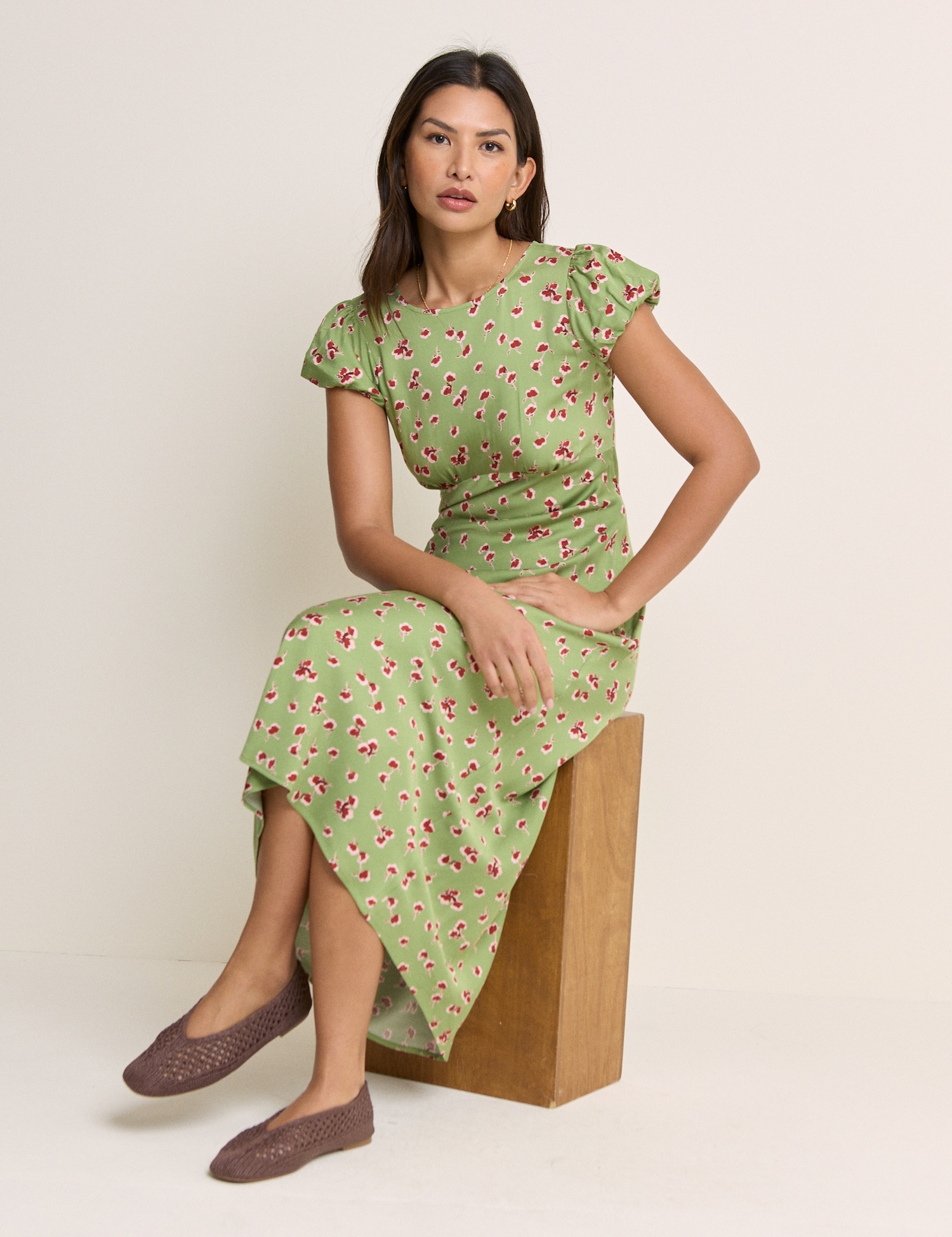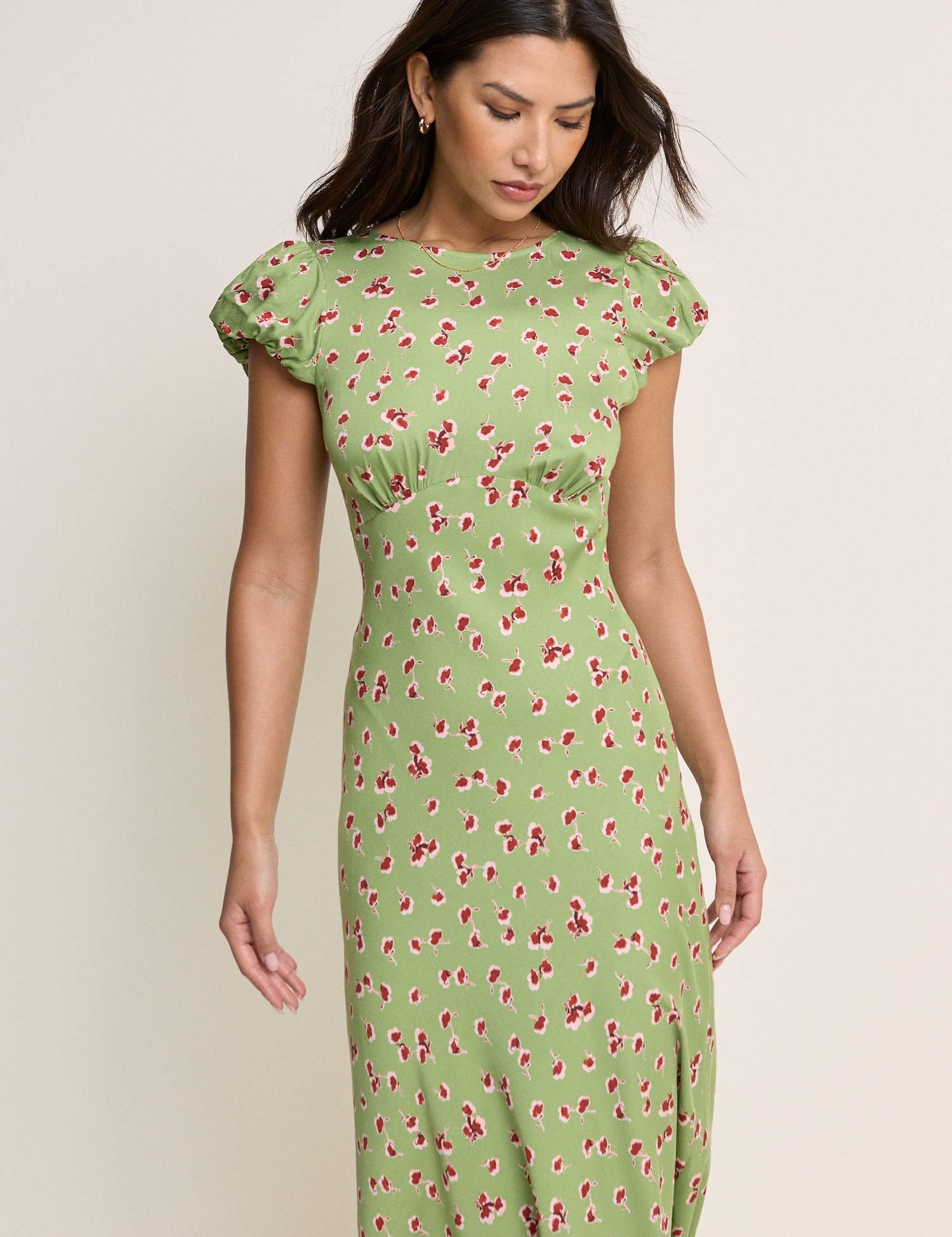 Lekka sukienka maxi w zielony kwiatowy wzór wygląda świeżo i elegancko. Klasyczny dopasowany krój sprawdza się na co dzień i na uroczyste okazje.